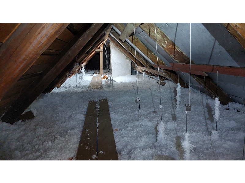 Doplnění izolace na stávajícím rodinném domě v Benešovicích se sedlovou a z části pultovou střechou byl trochu oříšek. Naši proškolení pracovníci ale i přes ztížené podmínky zvládli odvést rychlou a kvalitní práci. Středem půdy vedla prkenná revizní lávka. Jako první bylo třeba nafoukat z nezvednuté lávky část pultové střechy, což bylo z hlediska špatného přístupu obtížné. Poté bylo zapotřebí lávku zvednout a udělat bednění. Po dohodě s investorem jsme rovněž nafoukali 1-2 pytle izolace navíc, aby zde byla případná možnost opravy elektra. V Poctivé izolaci si zakládáme na individuálním přístupu. Každému Vašemu požadavku se snažíme vyhovět. Jako materiál jsme v případě stávajícího rodinného domu v Benešovicích použili skelnou minerální izolaci Supafil loft od společnosti Knauf, která se vyznačuje svoji nesléhavostí, prodyšností, nehořlavostí a nízkou objemovou hmotností, což je v případě lehkého sádrokartonového stropu velká výhoda. Šetřete na energiích už tuto zimu i Vy a poptejte si zateplení od Poctivé izolace. Naše práce nás baví!