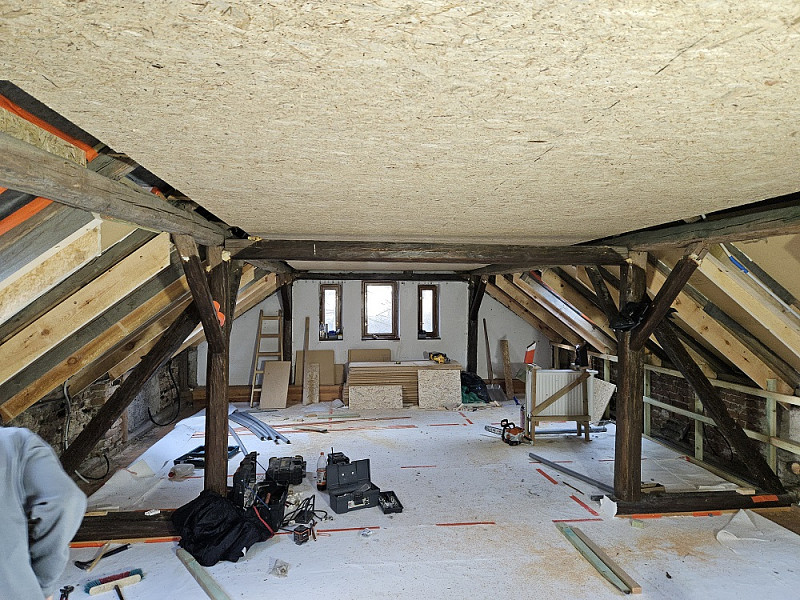 V půli února 2025 zateplila Poctivá izolace stávající rodinný dům v Přibyslavi. Rodinný dům staršího data výstavby se sedlovou střechou musel investor kvůli zatékající vodě do střešní konstrukce za spolupráce tesařů rekonstruovat. Podhled z palubek v interiéru, které se vlhkostí prohýbaly, investor odstranil, vyměnily se některé dřevěné části krovu, pod střešní krytinu se dala střešní fólie a mezi krokve se instalovaly Pavatex desky. Jelikož jsme po dohodě s investorem k zateplení šikmé části střechy vybrali foukanou dřevovláknitou izolaci skrze její výborné akumulační schopnosti, bylo potřeba prostavit krokve, zde pomocí trámků, aby se při zaklopení OSB deskami vytvořili takzvané komory. Jakmile bylo vše připravené, OSB podhledy jak na stropě, tak i na šikmých částech střechy, kolem konstrukcí stojek vypěněné a kolem střešních oken řádně vyvatováno, mohl již náš profi tým proškolených pracovníků do každé komory vykroužit otvor pro aplikaci izolace a její hutnění v daném objemu, kdy se vlákna přizpůsobí tvaru konstrukce a vyplní tak všechna místa komory. Otvory již za námi uzavírali ve spolupráci tesaři. Strop podkroví již bylo možno izolovat z prostoru půdy, kde se volně nafoukala též dřevovláknitá izolace ve vrstvě 35 cm. Na celkovou plochu pro zateplení asi 120 m2 jsme tedy zhotovili novou vrstvu izolace, hutněním do šikmin a volně na vodorovný strop. Jako materiál byla zvolena dřevovláknitá izolace Steico zell od společnosti Steico. Vznikla tak nová plně funkční izolační vrstva bez jakýchkoliv tepelných mostů, která zajistí dokonalý tepelný komfort v domě po celý rok.