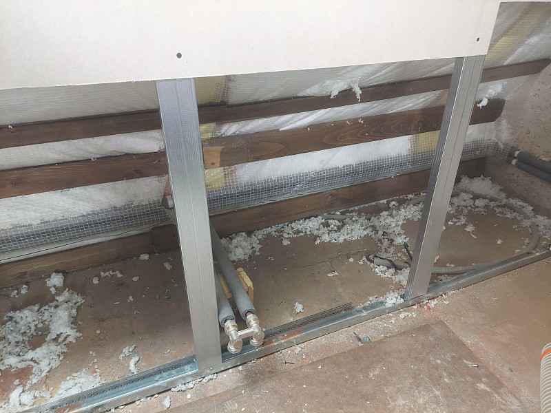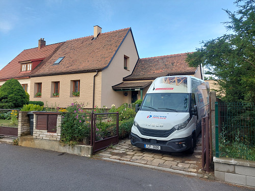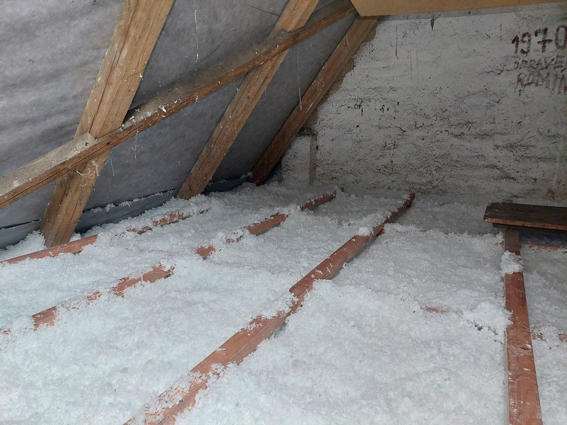 V půli července zateplila Poctivá izolace strop a šikminy střechy staršího rodinného domu v Jihlavě. Dům právě procházel jak rekonstrukcí střechy, kdy se sundaly střešní tašky pro výměnu latí a zpětné vrácení krytiny tentokráte s kontralatěmi a střešní fólií pro odvětrání střechy, tak i nově vytvořené sádrokartonové podhledy pro možnost budoucího podkrovního bydlení. Ve spolupráci se střechaři a sádrokartonáři jsme nad kleštiny pomocí úhelníků a latí vystavěli rošt, do kterého jsme nafoukali 30 cm vysokou vrstvu izolace a do šikmin střechy se izolace hutnila oproti vodorovné ploše ve vyšší objemové hmotnosti, kdy se izolace foukala mezi krokve a pod krokve. Na celkovou plochu asi 50 m2 bylo tedy třeba zhotovit novou vrstvu izolace. Jako materiál byla zvolena skelná minerální izolace Supafil loft od společnosti Knauf. Vznikla tak nová plně funkční izolační vrstva bez jakýchkoliv tepelných mostů, která zajistí dokonalý tepelný komfort v domě po celý rok.