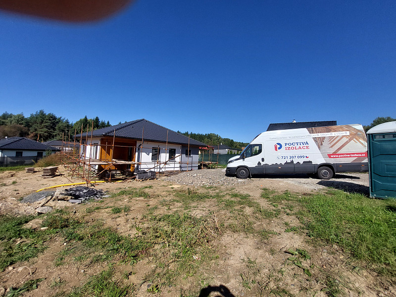 V říjnu 2025 zateplila Poctivá izolace strop novostavby bungalovu na Tachovsku v obci Halže. Rodinný dům disponoval valbovou střechou a krovem ze sbíjených vazníků. Pod vazníky byla již nachystána parotěsná folie jištěná latěmi a středem byla vystavěna pochozí plocha z prken. Na celkovou plochu asi 100 m2 bylo tedy třeba zhotovit vrstvu izolace danou projektem. Jako materiál byla zvolena dřevovláknitá izolace Steico zell od společnosti Steico, kterou náš profi tým proškolených pracovníků nafoukal na strop ve vrstvě vysoké 32 cm. Vznikla tak nová plně funkční izolační vrstva bez jakýchkoliv tepelných mostů, která zajistí dokonalý tepelný komfort v domě po celý rok.
