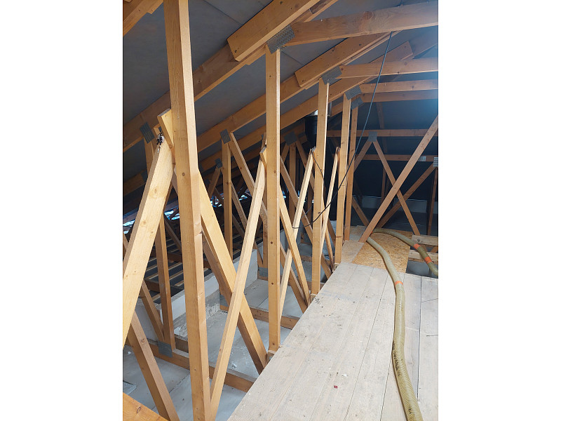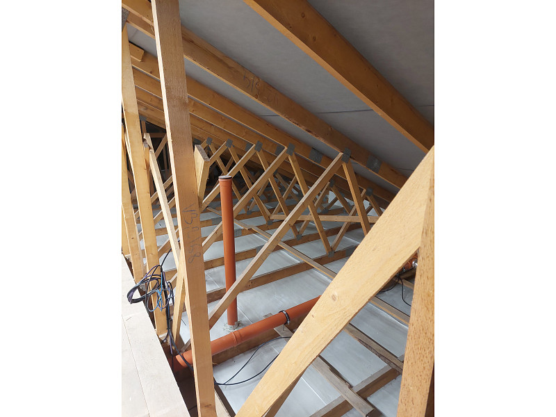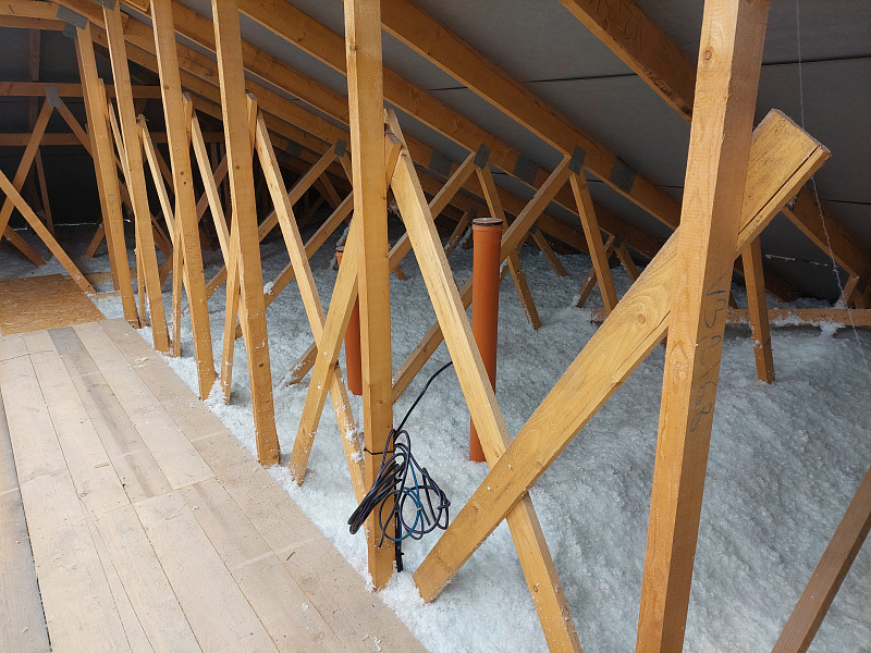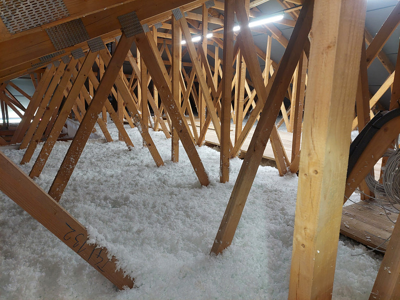 Ke konci října 2025 zateplila Poctivá izolace strop novostavby bungalovu na Třebíčsku. Rodinný dům disponoval valbovou střechou s krytinou z tašek a krovem ze sbíjených vazníků. Středem studiového vazníku byla pochozí plocha z prken a ke spodní pásnici vazníků byla připevněna parotěsná folie nad instalační mezerou. Na celkovou plochu asi 240 m2 bylo tedy třeba zhotovit vrstvu izolace. Jako materiál byla zvolena skelná minerální izolace Supafil loft PRO od společnosti Knauf, kterou náš profi tým proškolených pracovníků nafoukal nad sádrokartonový strop mezi vazníky ve vrstvě vysoké 35 cm. Vznikla tak plně funkční izolační vrstva bez jakýchkoliv tepelných mostů, která zajistí dokonalý tepelný komfort v domě po celý rok.