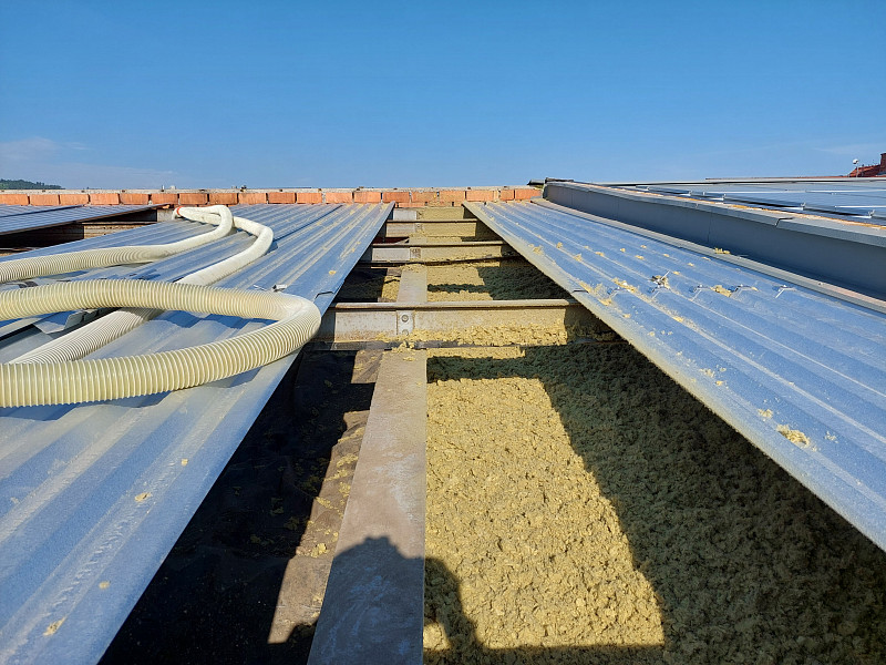 Na začátku května 2025 zateplila Poctivá izolace stávající halu v Rájci Jestřebí. Dlouhou halu se střešní krytinou z trapézového plechu a krovem z traverz bylo potřeba zateplit, a to z prostoru střechy, kde se část pásu krytiny odkryla tak, aby mohlo být izolováno s optickou kontrolou. Na celkovou plochu asi 176 m2 bylo tedy třeba zhotovit novou vrstvu izolace. Jako materiál byla zvolena minerální čedičová izolace Paroc BLT9 z kamenné vlny od společnosti Paroc, kterou náš profi tým proškolených pracovníků nafoukal na strop haly ve vrstvě vysoké 30 cm. Vznikla tak nová plně funkční izolační vrstva bez jakýchkoliv tepelných mostů, která zajistí dokonalý tepelný komfort v hale po celý rok.