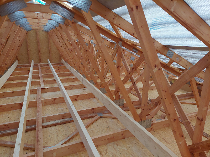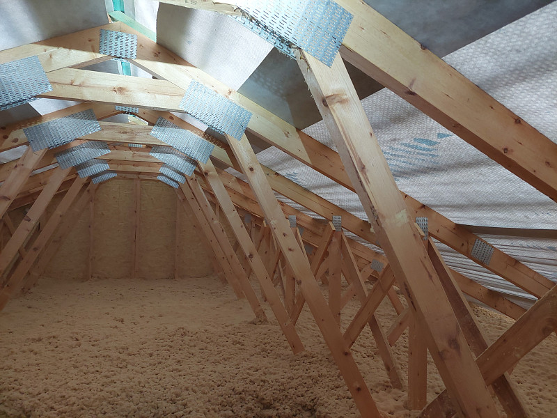 Na začátku června 2025 zateplila Poctivá izolace strop dřevěné novostavby v Suchohrdlech na Znojemsku. Rodinný dům disponoval sedlovou střechou s vazníkovou konstrukcí krovu. Pod spodní pásnicí vazníků byl OSB podhled, na který náš profi tým proškolených pracovníků nafoukal 40 cm vysokou vrstvu izolace mezi vazníky v celé ploše půdy cca 140 m2. Jako materiál byla zvolena dřevovláknitá izolace Naturheld. Vznikla tak nová plně funkční izolační vrstva bez jakýchkoliv tepelných mostů, která zajistí dokonalý tepelný komfort v domě po celý rok.
