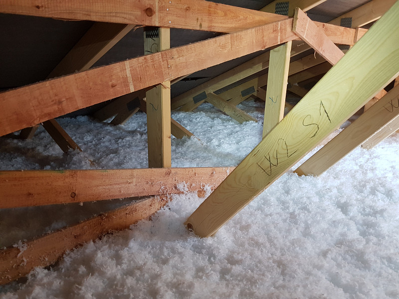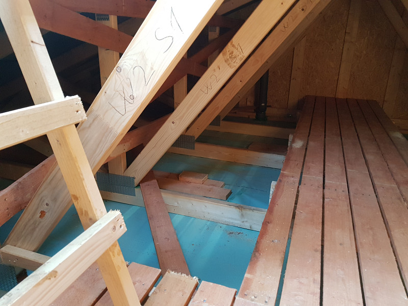 Novostavba dřevostavby rodinného domu ve Šťáhlavech. Strop dřevostavby ve Šťáhlavech má typickou skladbu pro dřevostavby typu bungalov. Střešní konstrukci tvoří dřevěný sbíjený vazník. Souvrství podhledu je tvořeno parotěsnou fólii s dřevěnými latěmi, do kterých je kotvena sádrokartonová deska. Celý strop je zaizolován foukanou Poctivou izolací Supafil loft o výšce 35 cm, což zaručuje dokonalé tepelně izolační vlastnosti. Izolace stropu tvoří souvislou vrstvu bez tepelných mostů.