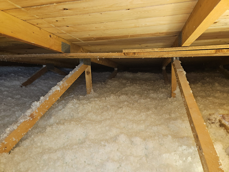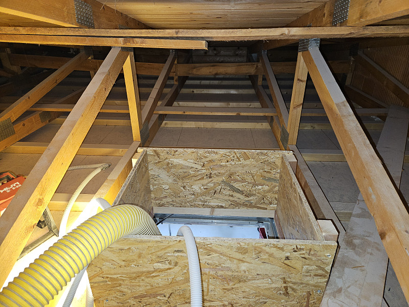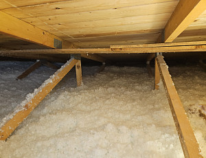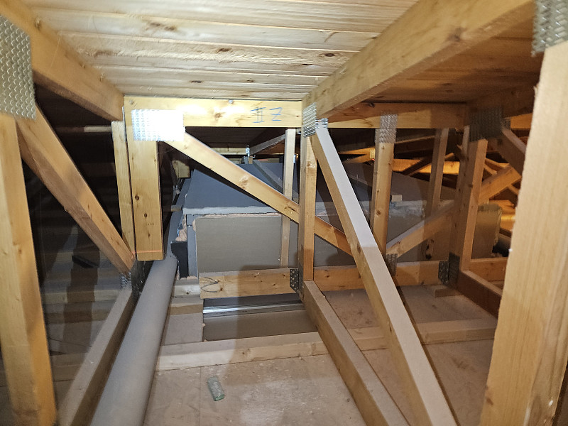 Ke konci března 2025 zateplila Poctivá izolace novostavbu budovy stojící ve vnitrobloku. Dvoupodlažní budovu obdélníkového tvaru s dvouplášťovou střechou a vazníkovou konstrukcí krovu bylo potřeba zateplit pomocí foukané minerální izolace tak, aby na obednění výtahové šachty byla stejná vrstva izolace, tedy izolování náběhem. Na OSB desky pod spodní pásnicí vazníků, na plochu cca 97 m2, nafoukal náš profi tým proškolených pracovníků 31 cm vysokou izolační vrstvu. Jako materiál byla zvolena skelná minerální izolace Ursa Pure Floc od společnosti Ursa. Vznikla tak nová plně funkční izolační vrstva bez jakýchkoliv tepelných mostů, která zajistí dokonalý tepelný komfort v domě po celý rok.