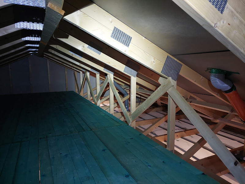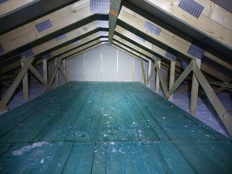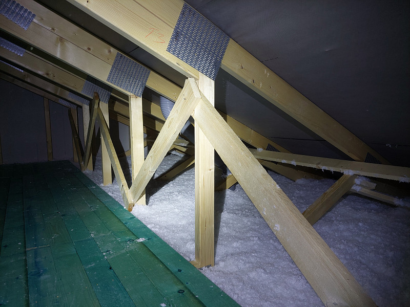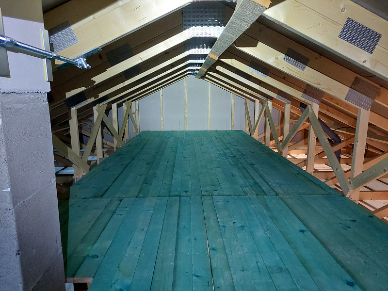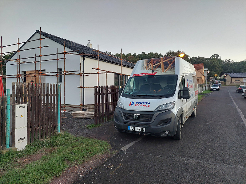 Na konci září 2024 zateplila Poctivá izolace novostavbu rodinného domu v Březně. Bungalov se sedlovou střechou, krovem z vazníků a budoucím sádrokartonovým stropem jsme izolovali vrstvou 30 cm. Středem byla vystavěna pochozí plocha z prken s větranými mezerami a na spodní pásnici svěšen rošt s parotěsnou fólií. Stropní výlez bude poté usazen, jakmile sádrokartonáři udělají SDK strop. Jako materiál byla zvolena skelná minerální izolace Supafil loft od společnosti Knauf, kterou náš profi tým proškolených pracovníků nafoukal na parotěsnou fólii na roštu ve vrstvě vysoké 30 cm. Vznikla tak nová plně funkční izolační vrstva bez jakýchkoliv tepelných mostů, která zajistí dokonalý tepelný komfort v domě po celý rok.