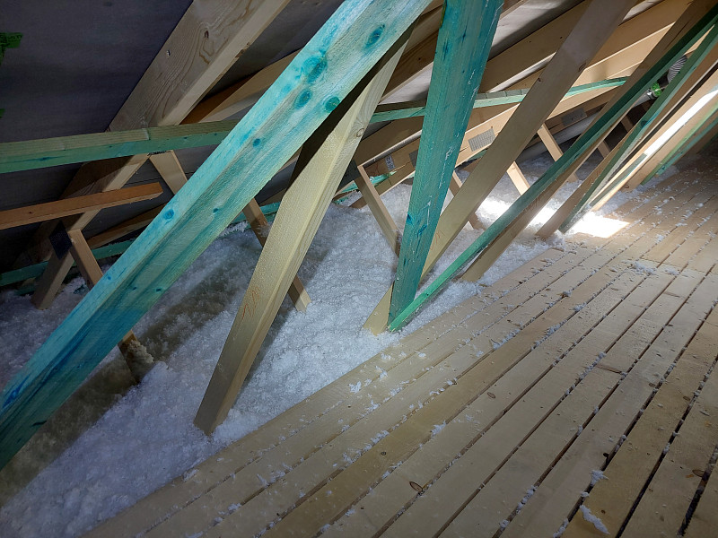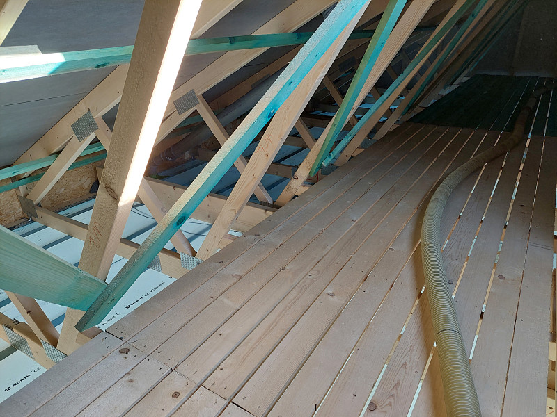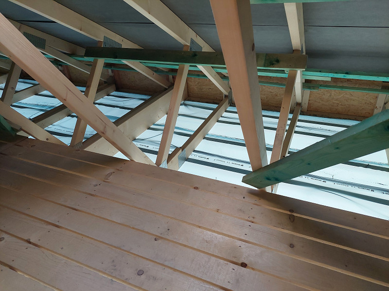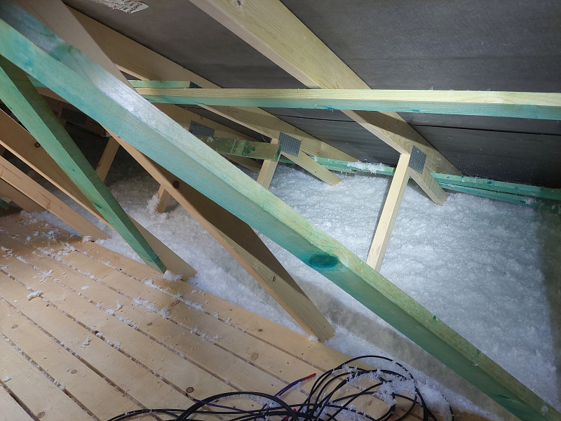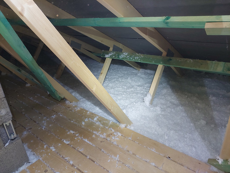 V polovině července 2024 vyjela Poctivá izolace jako subdodavatel pro foukanou tepelnou izolaci zateplit sádrokartonový strop novostavby/dřevostavby. Rodinný dům se sedlovou střechou, sbíjeným studiovým vazníkem a budoucím sádrokartonovým podhledem bylo potřeba izolovat 30cm vrstvou izolace. Stropní výlez do půdního prostoru byl obedněn a středem půdního prostoru vystavěna revizní lávka z prken s větranými mezírkami. Na spodní pásnici vazníků byla přidělána parotěsná fólie, kvalitní Würth s řádně lepenými spoji, a jelikož nebyl hotov sádrokartonový strop, byla fólie zespoda jištěna latěmi. Na celkovou plochu asi 80 m2 se na parotěsnou fólii mezi vazníky aplikovala tepelná foukaná izolace. Jako materiál byla zvolena skelná minerální izolace z bílého panenského vlákna od společnosti Knauf Insulation. Vznikla tak nová plně funkční izolační vrstva bez jakýchkoliv tepelných mostů, která zajistí dokonalý tepelný komfort v domě po celý rok.