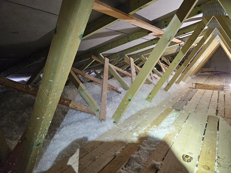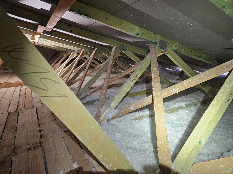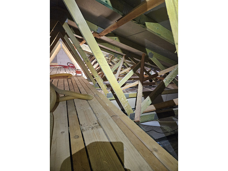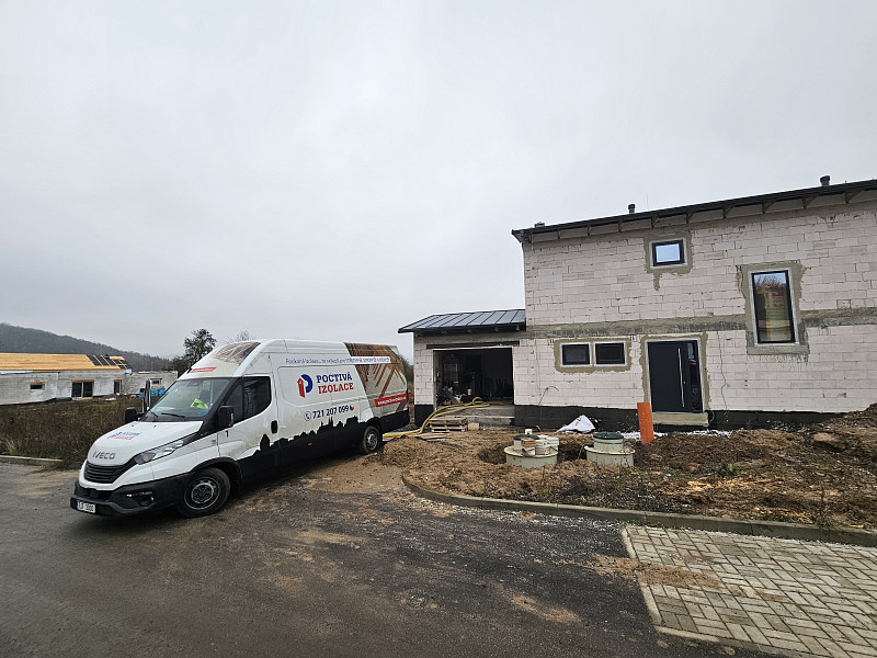 Na samém začátku prosince 2025 zateplila Poctivá izolace strop novostavby rodinného domu v Miřeticích u Klášterce nad Ohří. Patrový rodinný dům disponoval sedlovou odvětrávanou střechou s krytinou z falcovaného plechu a krovem ze sbíjených vazníků. Stavitel měl půdní prostor pro nafoukání izolace již připraven – zvýšené ohraničení kolem stropního výlezu, středovou plochu ve vazníku zaklopenou prkny s větranými mezerami a na věnci ohraničení z EPS tak, aby se izolace nefoukala do přesahu střechy, kde bude teprve s fasádním zateplením doděláno podbití. Na celkovou plochu asi 90 m2 bylo tedy třeba zhotovit vrstvu izolace. Jako materiál byla zvolena skelná minerální izolace Ursa Pure Floc od společnosti Ursa, kterou náš profi tým proškolených pracovníkůnafoukal na sádrokartonový strop svěšený pod spodní pásnicí vazníků ve vrstvě vysoké 38 cm. Vznikla tak nová plně funkční izolační vrstva bez jakýchkoliv tepelných mostů, která zajistí dokonalý tepelný komfort v domě po celý rok.