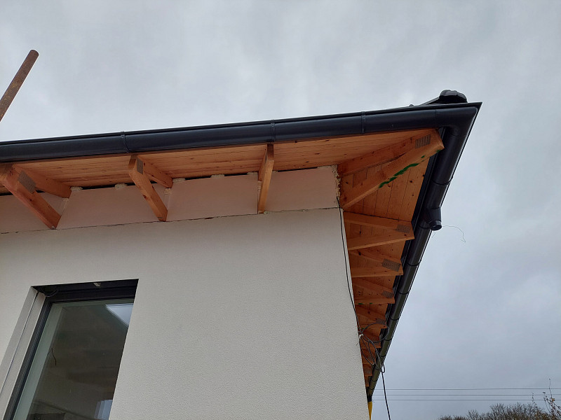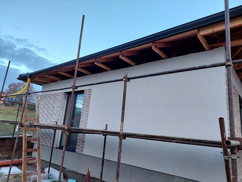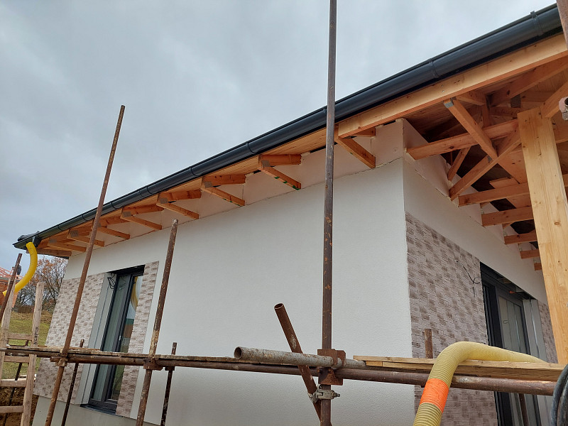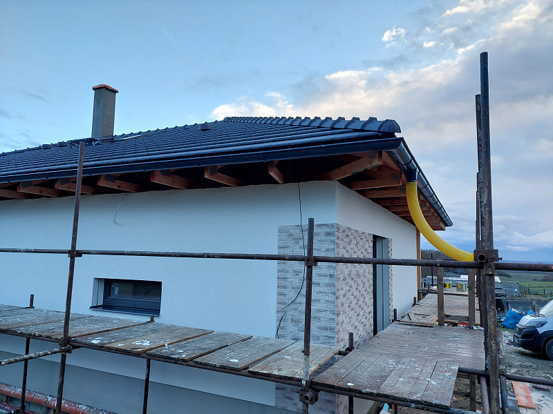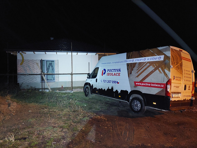V listopadu 2024 zateplila Poctivá izolace novostavbu rodinného domu v Loučni. Rodinný dům typu bungalov disponoval valbovou střechou s krytinou z tašek a dnes již málo viděným prkenným podbitím. Jelikož fasádní polystyren nebyl vytažen až ke střeše, bylo třeba na celém obvodu domu vytvořit lem, v tomto případě z polystyrenových desek tak, aby izolace při aplikaci nepadala mimo podstřešní část a mohla se foukat až na věnec. Lemy naši pracovníci tvoří v případě, kdy není dokončeno podbití přesahu střechy, a to vždy po domluvě s investorem. V podstřešním prostoru s krovem ze sbíjených vazníků byla připravena pochozí lávka středem pro snadnou průchodnost s hadicí pro foukání izolace. Na sádrokartonový strop s parotěsnou fólií, kde rošt byl svěšen pod spodní pásnicí vazníků, nafoukal náš profi tým proškolených pracovníků izolační vrstvu vysokou 35 cm pod a mezi vazníky. Vznikla tak plně funkční izolační vrstva bez jakýchkoliv tepelných mostů, která zajistí dokonalý tepelný komfort v domě po celý rok. Jako materiál byla zvolena skelná minerální izolace Supafil loft PRO od společnosti Knauf.