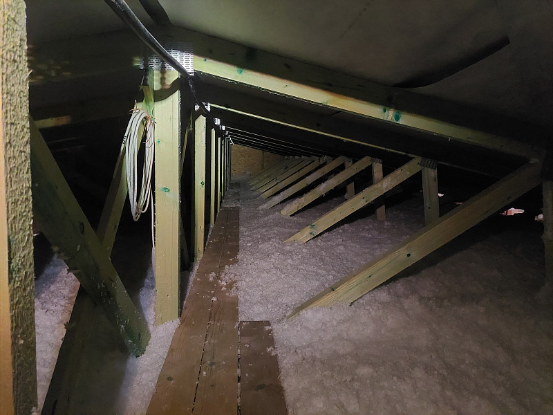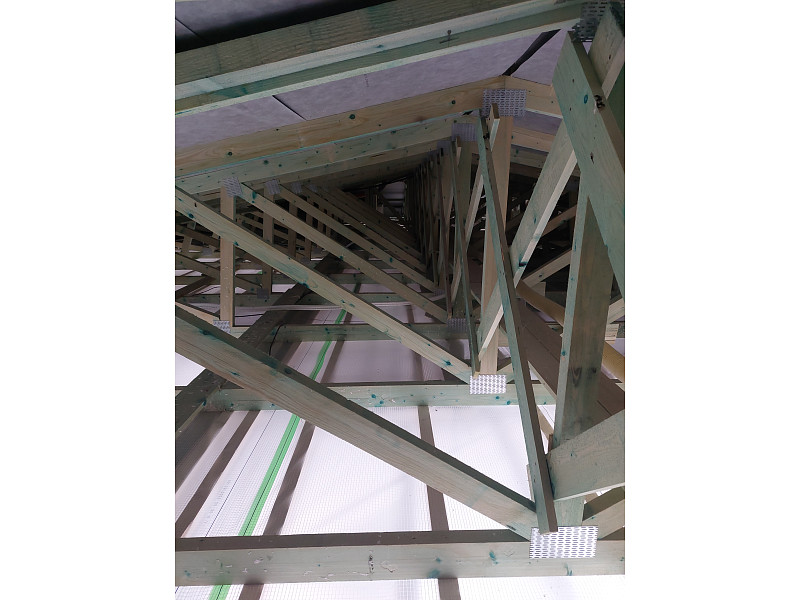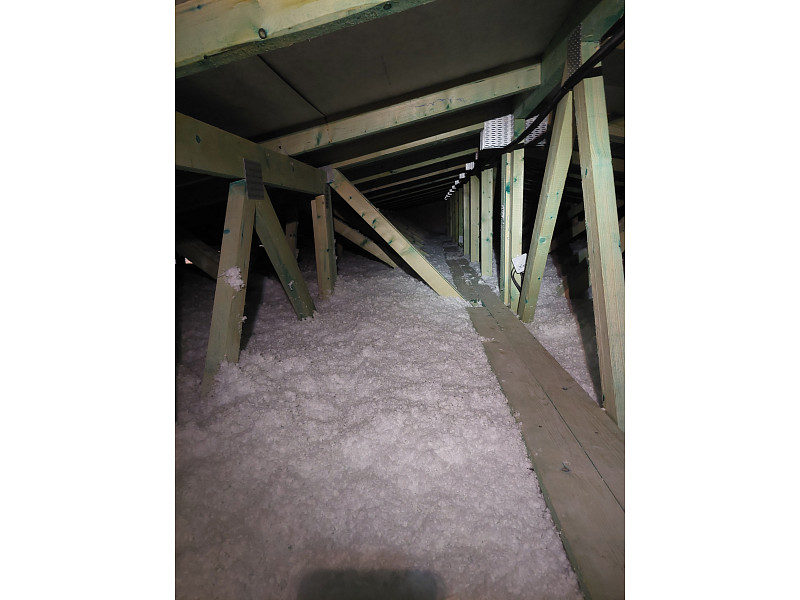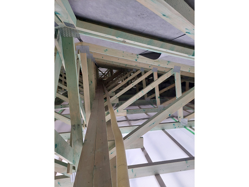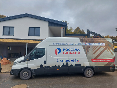 V říjnu 2025 zateplila Poctivá izolace strop novostavby rodinného domu v Hájku u Ostrova. Rodinný dům disponoval sedlovou střechou s nízkým sklonem a plechovou krytinou. Ke spodní pásnici vazníků byla připevněna latěmi parotěsná folie s řádnými přelepy a na vnější obvodové zdi vypěněn lem z EPS pro nafoukání izolace na věnec. Na celkovou plochu asi 210 m2 bylo tedy třeba zhotovit novou vrstvu izolace. Jako materiál byla zvolena skelná minerální izolace Supafil loft PRO od společnosti Knauf, kterou náš profi tým proškolených pracovníků nafoukal na parotěsnou folii mezi vazníky ve vrstvě 40 cm. Vznikla tak nová plně funkční izolační vrstva bez jakýchkoliv tepelných mostů, která zajistí dokonalý tepelný komfort v domě po celý rok.