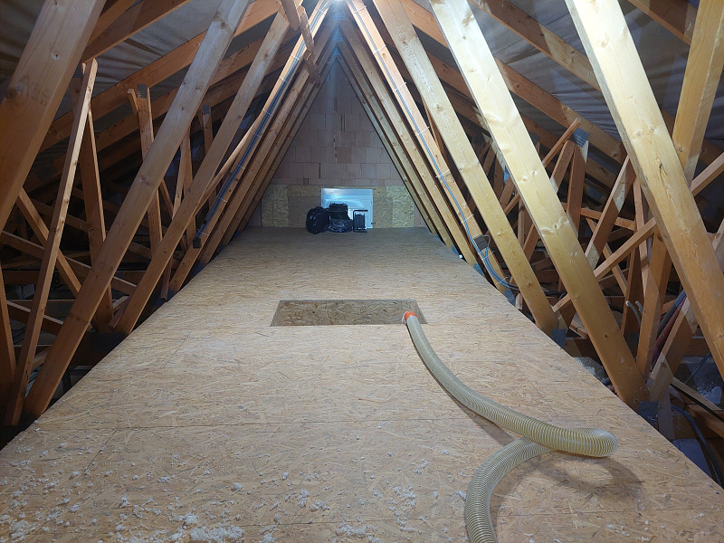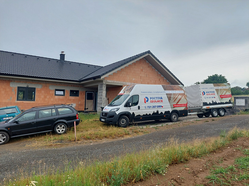 Začátkem července 2025 zateplila Poctivá izolace strop novostavby bungalovu ve Vilémovicích. Novostavba rodinného domu disponovala sedlovou střechou s krytinou z tašek. Jakmile měl investor dokončen sádrokartonový strop s parotěsnou fólií a ve středové ploše vazníkového krovu vystavěnou pochozí plochu s obedněným stropním vlezem, mohl náš profi tým proškolených pracovníků nafoukat na celou plochu stropu, cca 182 m2, lehkou minerální nehořlavou izolaci ve vrstvě 40 cm s tím, že se přefoukala i obvodová zeď směrem do podbití. Jako materiál byla zvolena skelná minerální izolace Ursa Pure Floc. Vznikla tak nová plně funkční izolační vrstva bez jakýchkoliv tepelných mostů, která zajistí dokonalý tepelný komfort v domě po celý rok.