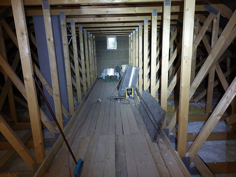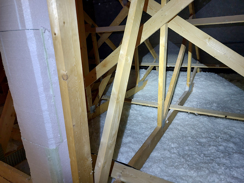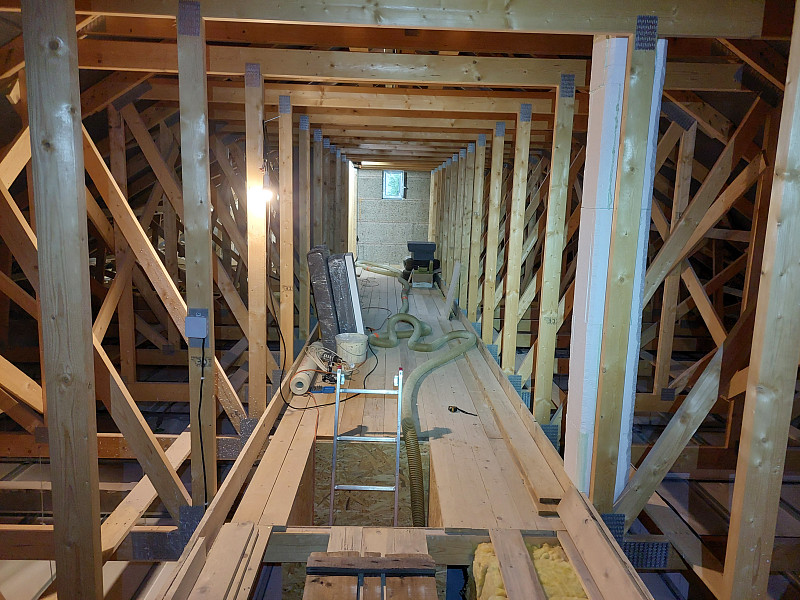 Při zateplování sádrokartonového stropu svěšeného pod spodní pásnicí vazníků v novostavbě rodinného domu ve Vrchlabí bylo potřeba na celkovou plochu cca 170 m2, pod pochozí prkennou plochu, na vystupující zeď do půdního prostoru a na věnec, nafoukat 42 cm vysokou izolační vrstvu. Jedině foukaná izolace dokáže ve vazníkové střešní konstrukci efektivně vytvořit souvislou vrstvu zateplení stropu bez tepelných mostů. Díky Poctivé izolaci navíc budete mít zatepleno rychle, dokonale a hlavně poctivě. Jako materiál byla v případě zateplení novostavby rodinného domu ze stavebního systému Izolox použita minerální skelná izolace Supafil loft PRO od společnosti Knauf. Supafil má mnoho skvělých výhod – nesléhává, je prodyšný, nehořlavý, ekologický a má nízkou objemovou hmotnost. Poctivá izolace má ve své nabídce celkem 5 druhů izolačních materiálů. Krom minerálních skelných izolací jsou to rovněž minerální čedičové izolace, celulózové neboli papírové izolace, dřevovláknité a polystyrénové izolace. S výběrem toho pravého izolačního materiálu pro Váš typ konstrukce Vám v Poctivé izolace rádi poradíme a pomůžeme. Máme za sebou již stovky zakázek a řadu let zkušeností, o které se s Vámi rádi podělíme. Poptejte si zateplení stropu či střechy i Vy. Nechte se inspirovat našimi realizacemi nebo nám Zavolejte 721207099 a my Vám rádi se zateplením Vašeho stropu nebo zateplení střechy poradíme a pomůžeme.