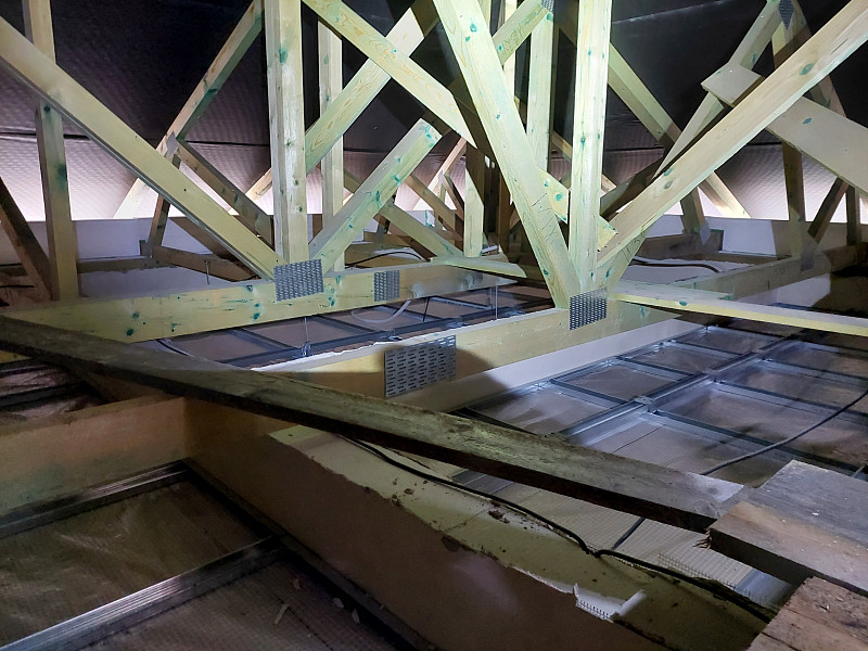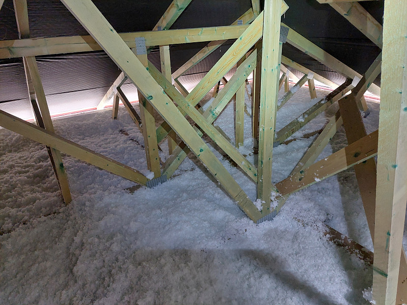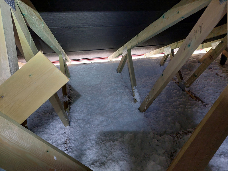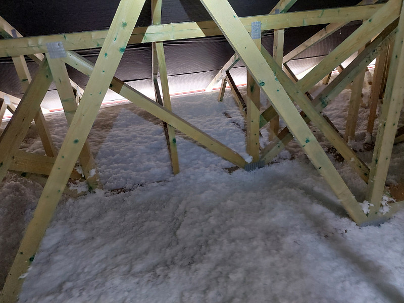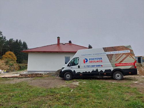 Ke konci října 2024 zateplila Poctivá izolace novostavbu rodinného domu v Horách u Jenišova. Rodinný dům disponoval valbovou střechou s plechovou krytinou na latích pro odvětrávání střechy do hřebene. Krov ze sbíjených vazníků a sádrokartonovým stropem svěšeným pod spodní pásnicí vazníků bylo třeba izolovat dle zadání projektanta skelnou minerální izolací Supafil Loft PRO od společnosti Knauf Insulation. Před samotnou realizací se řešily přípravy pro izolování, kde bylo třeba vytvořit na obvodové zdi lemy z EPS, aby izolace nepadala při aplikaci mimo podstřešní prostor, kde nebylo zatím dokončeno podbití. Stropní výlez se stahovacími schůdky stavební firma též připravila zvýšením obednění tohoto výlezu. Jakmile bylo vše připraveno a tím dán i termín pro realizaci, přijel náš profi tým proškolených pracovníků a nafoukal minerální izolaci Supafil Loft PRO na sádrokartonový strop ve vrstvě vysoké 35 cm. Příčky vystupující do půdního prostoru se přefoukali stejnou vrstvou izolace. Vznikla tak nová plně funkční izolační vrstva bez jakýchkoliv tepelných mostů, která zajistí dokonalý tepelný komfort v domě po celý rok.