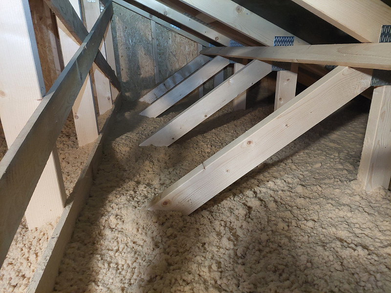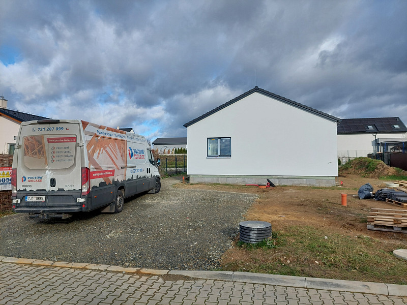 V listopadu 2024 zateplila Poctivá izolace novostavbu rodinného domu v Městě Touškov. Novostavba disponovala sedlovou střechou s krytinou z tašek. Krov byl ze sbíjených vazníků, kde pod spodní pásnicí byl zavěšen rošt se sádrokartonovým stropem a na roštu řádně lepená silná parotěsná folie. Od stropního výlezu vedla revizní lávka pro kontrolu podstřeší. Jako materiál byla zvolena dřevovláknitá izolace Steico zell od společnosti Steico, kterou náš profi tým proškolených pracovníků nafoukal na sádrokartonový strop ve vrstvě vysoké o 20% vyšší oproti požadované, pro její sesednutí na deklarovanou výšku 32 cm. Vznikla tak plně funkční izolační vrstva bez jakýchkoliv tepelných mostů, která zajistí dokonalý tepelný komfort v domě po celý rok.