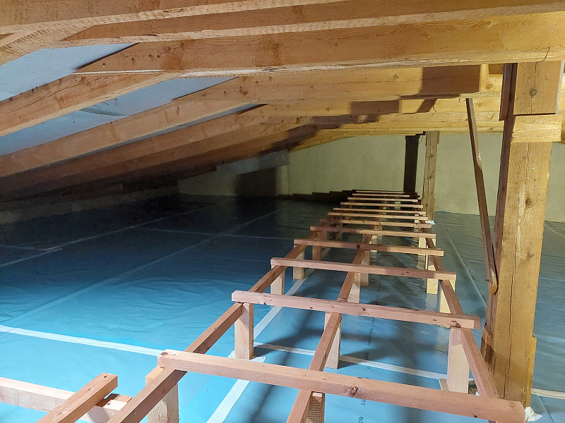 Začátkem července 2024 se naše parta foukačů vydala do města obklopeného lesy a poznamenaného uhelným těžebním průmyslem. Poctivá izolace jela zateplit strop patrového domu v centru města. V první řadě po samotné obhlídce naším technikem bylo zapotřebí, aby majitel zajistil u místního úřadu parkovací povolení pro zaparkování našeho vozu s izolací před samotným domem. Jakmile bylo povolení na světě, mohli jsme přijet a začít se samotnou izolací stropu. Jednalo se o patrový dům s mansardami, nad nimiž byla půda s betonovou podlahou a nepochozí stropy nad mansardami. Na podlahu jsme položili kvalitní silnou parotěsnou fólii řádně přelepenou páskou a obednili rám stropního vlezu. Posléze jsme středem půdního prostoru – od štítu ke štítu – vystavěli širokou revizní lávku a odkládací plochu do stran od vlezu pro přístup ke střešnímu oknu. Na plochu betonové podlahy jsme aplikovali foukanou izolaci ve vrstvě 30 cm a nad stropy mansard, kde již byla stávající izolace rolovaná s nedostačující výškou, jsme aplikovali foukanou izolaci ve výšce 20 cm tak, aby na celé ploše půdy vznikla souvislá izolační vrstva bez tepelných mostů. Na celkovou plochu asi 130 m2 bylo tedy třeba zhotovit souvislou vrstvu izolace vysokou 30 cm. Jako materiál byla zvolena skelná minerální izolace z panenského vlákna od společnosti Knauf Insulation, kterou náš profi tým proškolených pracovníků nafoukal na strop během chvilky. Vznikla tak nová plně funkční izolační vrstva bez jakýchkoliv tepelných mostů, která zajistí dokonalý tepelný komfort v domě po celý rok.