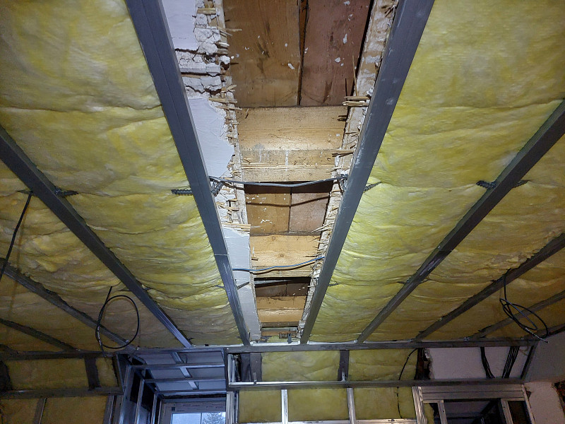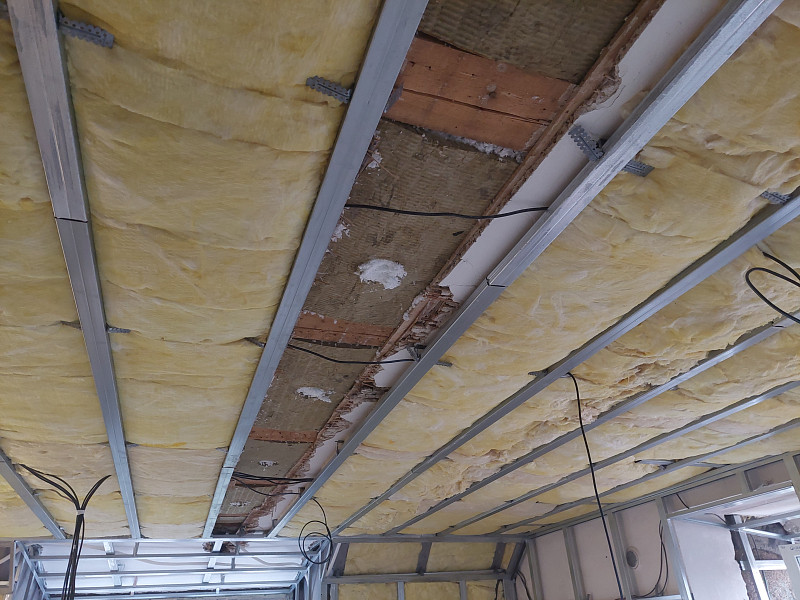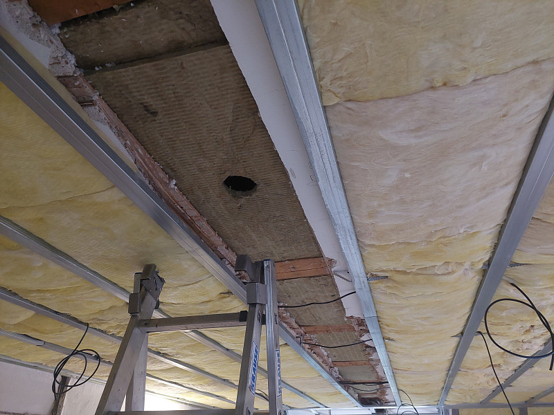 Koncem listopadu 2024 zateplila Poctivá izolace strop bytu v horním patře bytového domu. Byt procházel kompletní rekonstrukcí pomocí sádrokartonového podhledu, kdy rošt pro stropní podhled byl připevněn ke stávajícímu stropu z rákosu a omítky s prkenným podbitím. Jelikož minimálním snížením stropu byla možnost pouze izolovat nad roštem 10 cm rolovanou minerální vatou, ideálním řešením bylo využít prázdné trámové dutiny stropu, kde se izolace pomocí minerální foukané izolace nahutnila ve vrstvě 22 cm. Tím se zvýšil tepelný komfort stropu proti úniku tepla a maximálně se využila původní stropní konstrukce. Odklopený pruh stropu se provizorně uzavřel minerálními deskami a následně už sádrokartonáři mohou pokračovat v instalování parotěsné fólie a záklopu. Na celkovou plochu asi 67 m2 bylo tedy třeba zhotovit novou vrstvu izolace vyplněním trámové dutiny. Jako materiál byla zvolena skelná minerální izolace Ursa Pure Floc od společnosti Ursa, kterou náš profi tým proškolených pracovníků nafoukal na trámový strop ve vrstvě vysoké 22 cm s vyšším objemem izolace. Vznikla tak nová plně funkční izolační vrstva bez jakýchkoliv tepelných mostů, která zajistí dokonalý tepelný komfort v domě po celý rok.