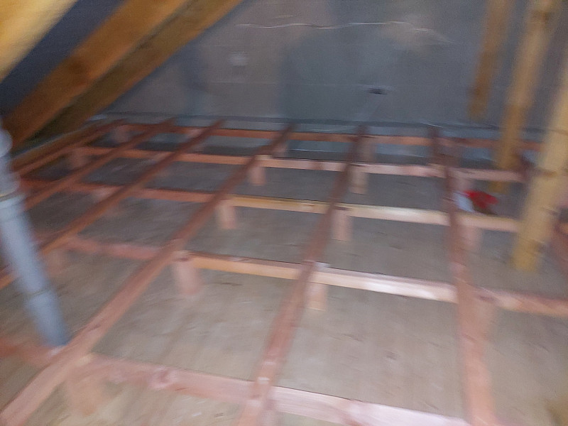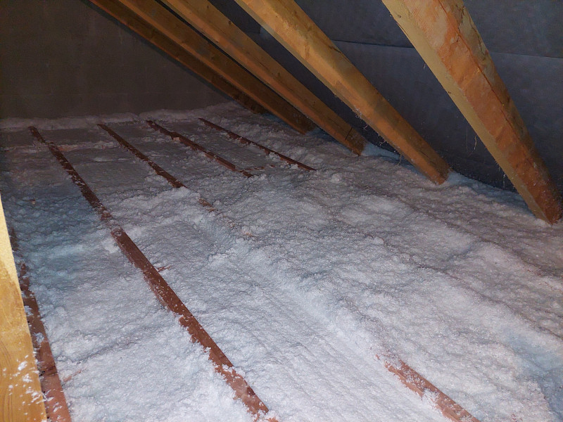 V srpnu 2024 zateplila Poctivá izolace stávající rodinný dům ve Zdicích. Rodinný dům se sedlovou střechou a krytinou z tašek měl půdní prostor členitý. Na prkenném podbití jsme na jedné části půdy vystavěli dřevěný rošt, do něhož jsme nafoukali izolaci a následně zaklopili OSB deskami. Druhou část půdy, kde byl pouze potřeba přístup ke střešnímu oknu, jsme vyfoukali izolací a vystavěli revizní lávku. Jako materiál byla zvolena skelná minerální izolace Supafil loft od společnosti Knauf, kterou náš profi tým proškolených pracovníků nafoukal na prkennou podlahu půdy ve vrstvě vysoké 20 cm, jelikož strop měl již stávající izolaci cca 12 cm. Do šikmin bylo potřeba též doplnit izolaci, kde se více hutnilo. Vznikla tak nová plně funkční izolační vrstva bez jakýchkoliv tepelných mostů, která zajistí dokonalý tepelný komfort v domě po celý rok.