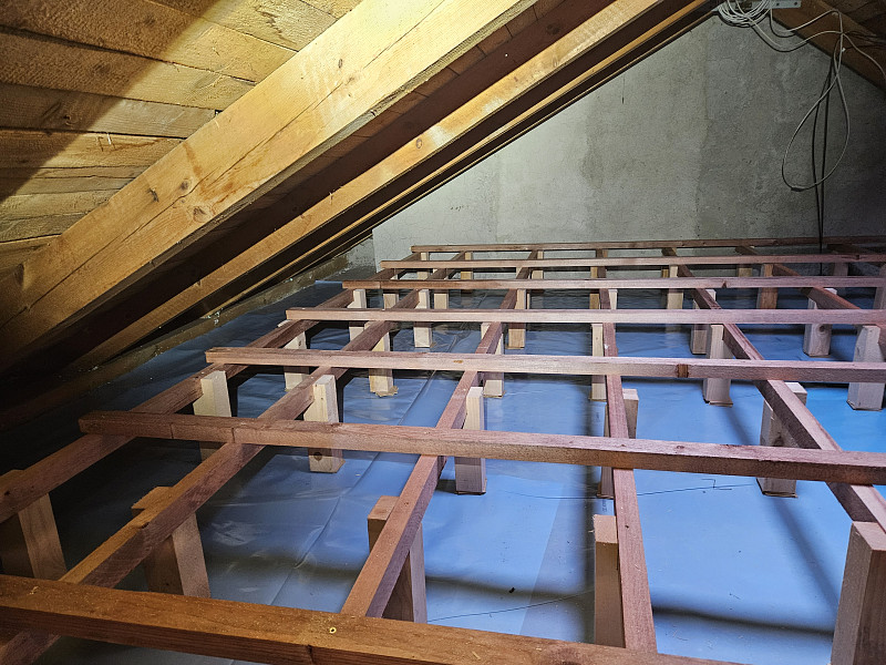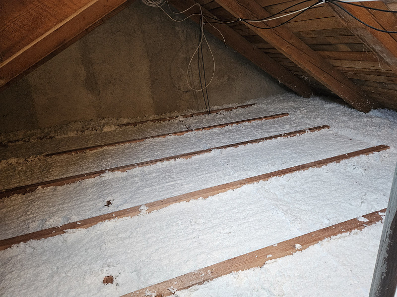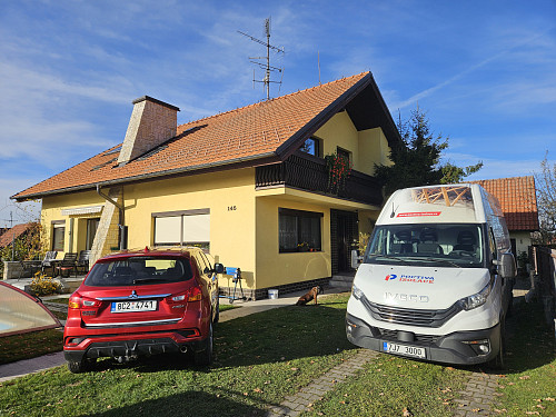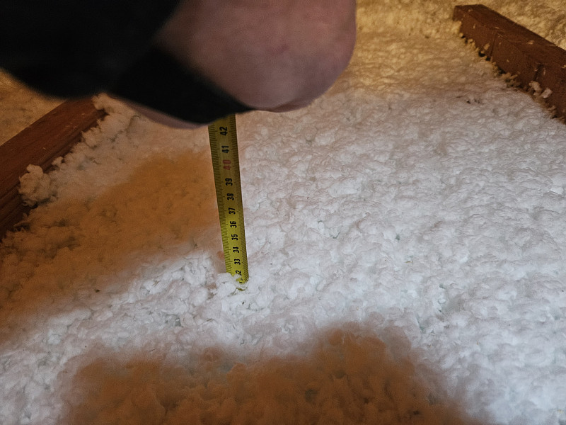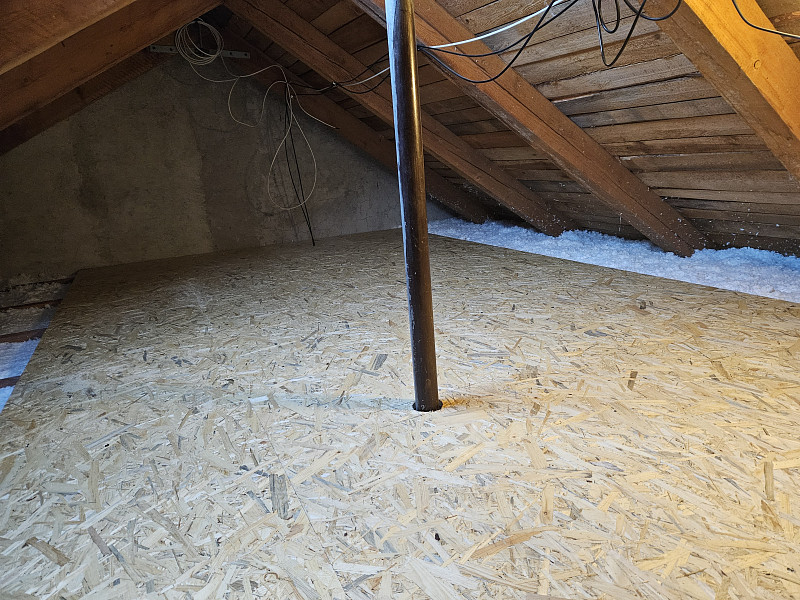 V listopadu 2025 zateplila Poctivá izolace strop stávajícího rodinného domu v obci Hůry na Českobudějovicku. Patrový dům disponoval sedlovou střechou s krytinou z tašek a trámovou konstrukcí krovu, kde podlaha půdy byla betonová na prkenném podbití. Nejprve náš profi tým proškolených pracovníků na podlahu půdy rozložil parotěsnou folii, na kterou vystavěl dřevěný rošt. Kolem stropního výlezu se stahovacími schůdky vytvořil schod pro snazší přístup na novou podlahu nad izolací. Na celkovou plochu asi 70 m2 nafoukal 30 cm vysokou izolační vrstvu a pomocí latí vytvořil mezi izolací a OSB egger deskami větranou mezeru. Jako materiál byla zvolena skelná minerální izolace Supafil loft PRO od společnosti Knauf. Vznikla tak nová plně funkční izolační vrstva bez jakýchkoliv tepelných mostů, která zajistí dokonalý tepelný komfort v domě po celý rok.