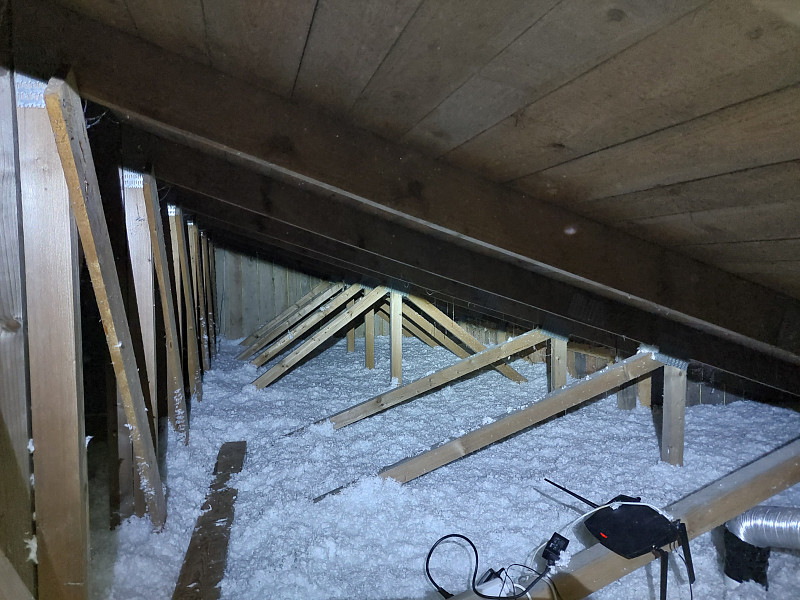 V dubnu 2024 zateplila Poctivá izolace strop stávajícího rodinného domu v obci Líšný. Rodinný dům se sedlovou střechou, krytinou z kanadské šindele na celoplošném prkenném bednění a vazníkovým krovem, pod nímž byl svěšen sádrokartonový podhled, měl již mezi spodní pásnicí vazníků loženou rolovanou minerální vatu, ale nedostatečné výšky 20 cm. Investor se tedy rozhodl strop, kudy mu unikalo v zimě teplo, doplnit o novou izolační vrstvu. Na celkovou plochu asi 76 m2 bylo tedy třeba zhotovit novou vrstvu izolace. Jako materiál byla zvolena skelná minerální izolace Supafil loft PRO od společnosti Knauf, kterou náš profi tým proškolených pracovníků nafoukal na sádrokartonový strop se stávající minerální vatou ve vrstvě vysoké 15 cm mezi vazníky. Vznikla tak nová plně funkční izolační vrstva bez jakýchkoliv tepelných mostů, která zajistí dokonalý tepelný komfort v domě po celý rok.