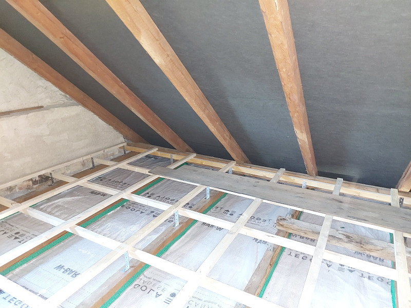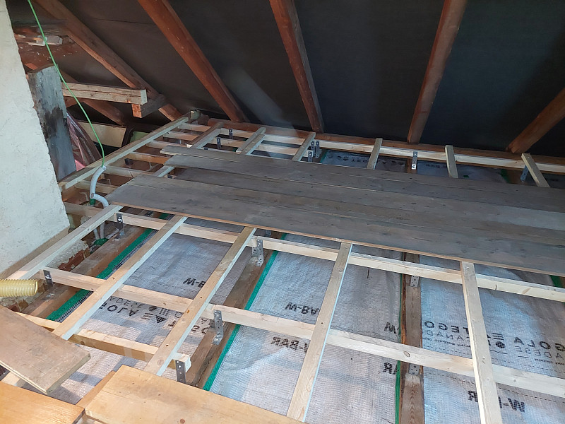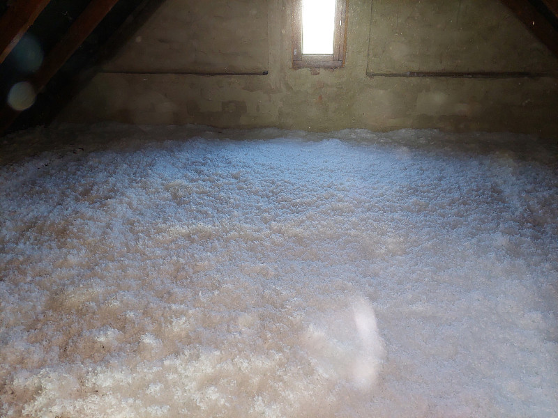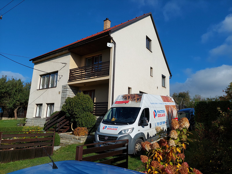 V půli října 2024 zateplila Poctivá izolace stávající rodinný dům v Nové Říši. Patrový rodinný dům se sedlovou střechou a trámovou vazbou krovu měl velkou prostornou a členitou půdu. Po konzultaci s naším technikem na místě, jak tyto plochy zateplit, aby byla půda nadále využívána, se majitel rozhodl, že plochy pro zateplení si připraví svépomocí po položení parotěsné fólie a vystavění dřevěného roštu na úhelnících, aby tím zvedl i pochozí plochu z prken pro zateplení vyšší vrstvou foukané izolace. Jakmile majitel měl vše pro aplikaci foukané izolace připravené, domluvil se termín realizace. Do vystavěného dřevěného roštu se na plochu 35 m2 nafoukala minerální izolace ve vrstvě 30 cm s vyšším objemem. Kolem komínů díky této minerální izolaci, která je nehořlavá, nebylo třeba dávat minerální desky. Jakmile byla izolace nafoukána do roštu nad vytápěnými místnostmi, majitel si svépomocí rošt zaklopil. Jako materiál byla zvolena skelná minerální izolace Supafil loft PRO od společnosti Knauf. Vznikla tak nová plně funkční izolační vrstva bez jakýchkoliv tepelných mostů, která zajistí dokonalý tepelný komfort v domě po celý rok.