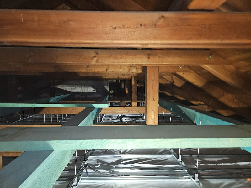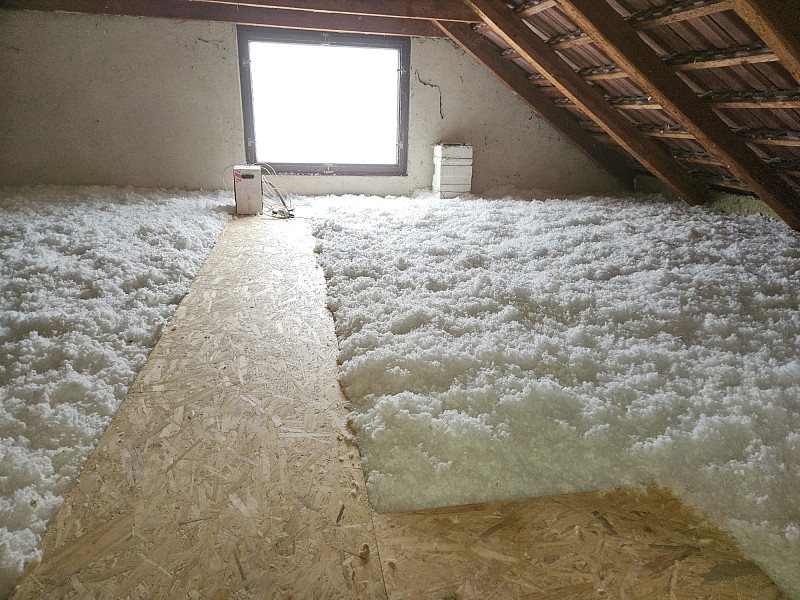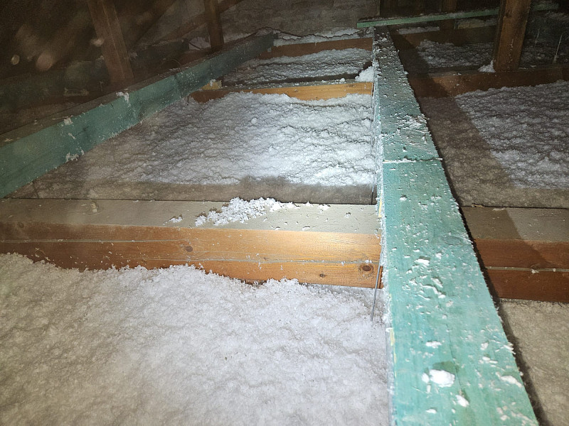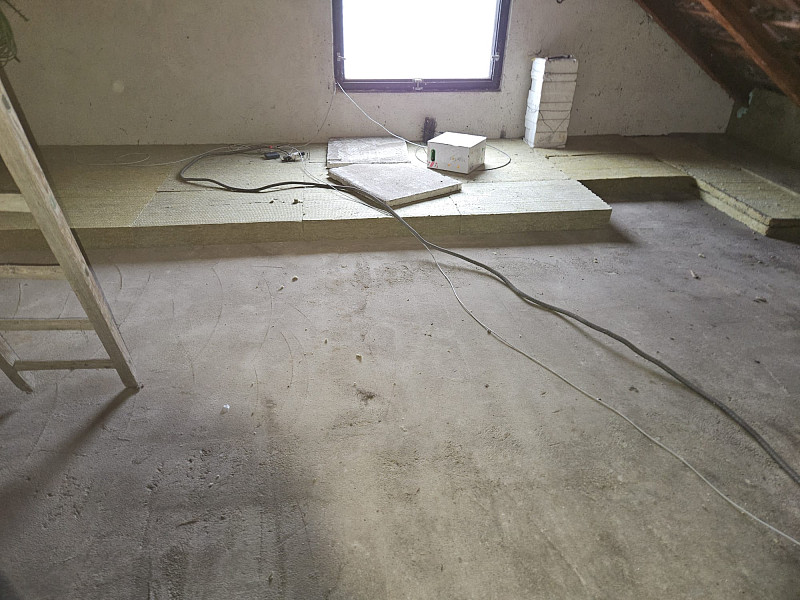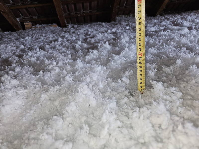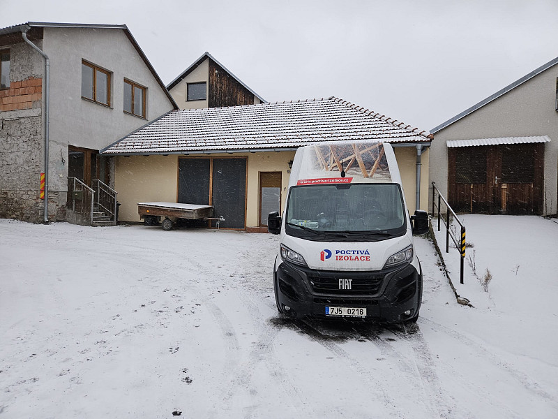 V polovině února 2025, kdy venku panoval únorový mráz, zateplila Poctivá izolace stávající patrový rodinný dům s obytným vejminkem v Náměšti nad Oslavou. Patrový rodinný dům disponoval sedlovou střechou s krytinou z tašek na latích na prkenném podbití. Zde náš profi tým proškolených pracovníků zateploval strop vrstvou izolace 30 cm na betonové podlaze půdy v ploše cca 66 m2, kde středem vystavěl revizní lávku a u stropního výlezu zvýšil rám. Kolem výlezu a navazujícího komínového tělesa vystavěl pochozí plochu. V přilehlé přízemní stavbě vejminku, kde byl sádrokartonový strop s roštem zavěšeným pod trámovou vazbou krovu, se nafoukala na parotěsnou fólii na plochu cca 80 m2 tepelná izolace ve vrstvě 45 cm. Jako materiál byla u obou staveb zvolena skelná minerální izolace Supafil loftod společnosti Knauf. Vznikla tak nová plně funkční izolační vrstva bez jakýchkoliv tepelných mostů, která zajistí dokonalý tepelný komfort v domě po celý rok.