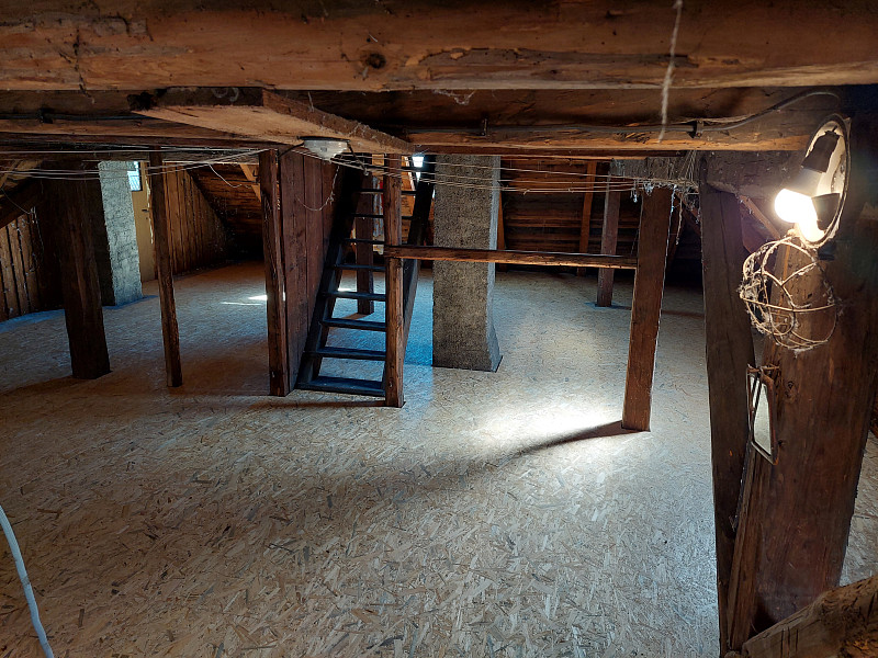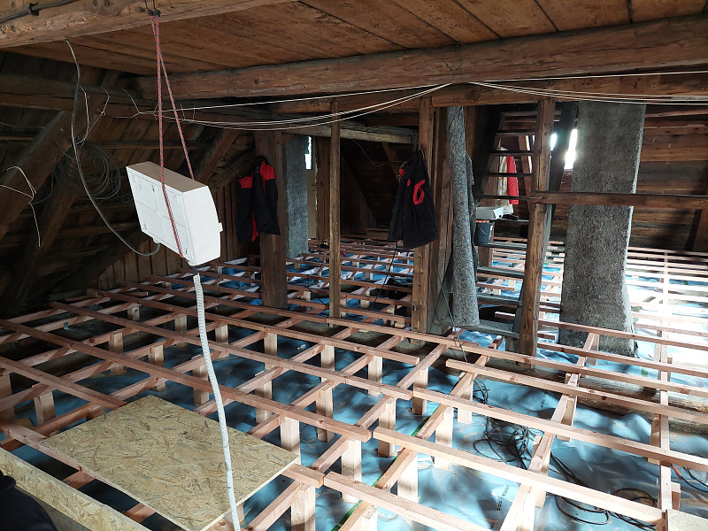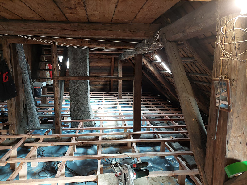Některé stropní konstrukce neumožňují aplikovat foukané izolace do dutin stropu, protože je buď nemají nebo jsou příliš nízké pro požadované vrstvy izolací. Příkladem může být dotační titul Nová zelená úsporám LIGHT, který vyžaduje minimální vrstvu izolace 30 cm. Který ze straších rodinných domů disponuje trámovou dutinou právě o výšce 30 cm? No málokterý. Proto má Poctivá izolace pro tyto případy vlastní řešení. Pokud majitel rodinného domu podlahu půdy aktivně využívá a zároveň chce provést zateplení podlahy půdy, tak je řešení Poctivé izolace dělané přímo pro něj. Na podlaze půdy postavíme rošt, do kterého velmi jednoduše aplikujeme požadovanou vrstvu izolace. Podlahový rošt Poctivá izolace vyrábí každému klientovi na míru a na požadovanou vrstvu izolace. Vrstva izolace může být jakákoliv. Podle požadované vrstvy foukané izolace vyrábíme výšku nosných špalíků. Pro zajištění pochůznosti nové podlahy celý rošt po zafoukaní izolace zaklopíme OSB deskami o síle 18 mm. Aby foukaná izolace byla chráněná před pronikající vlhkostí, tak pod rošt Poctivá izolace rozkládá parotěsnou fólii o gramáži 200 g/m2. Ze stejného podlahové roštu lze vystavět pouze chodníčky nebo-li revizní lávky. Těch se využívá na půdách, kde není požadované zachování plné pochůznosti v celé ploše půdy.