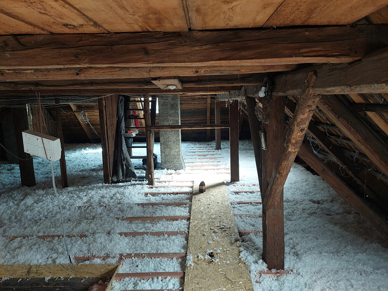 V březnu 2024 Poctivá izolace provedla zateplení stropu staršího rodinného domu včetně vybudování nové plně pochozí podlahy v Hanušovicích. Celková výměra stropu 117 m2 byla i celkovou výměrou pro nově budovanou podlahu, do které Poctivá izolace provedla foukanou izolaci o celkovém objemu 35,1 m3. Nově zhotovená podlaha na půdě rodinného domu je postavena z podlahového systému, který si Poctivá izolace pro své klienty vyrábí přímo na míru na požadovanou vrstvu foukané izolace.