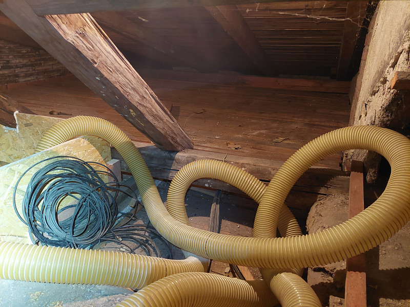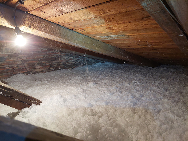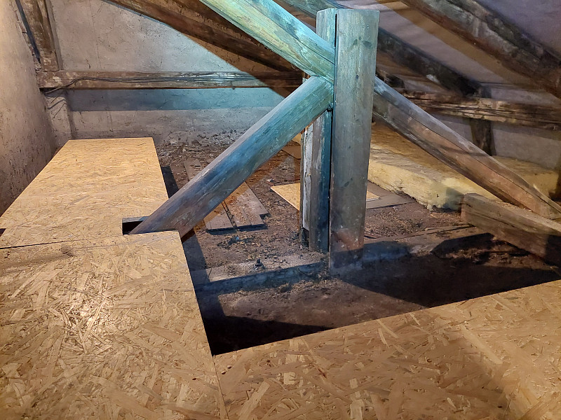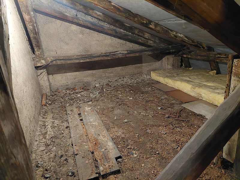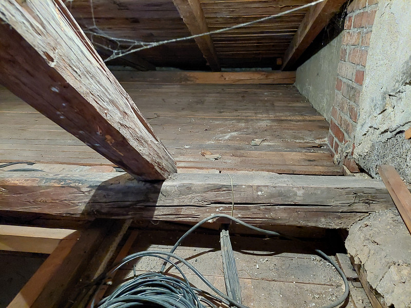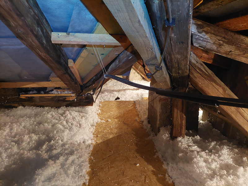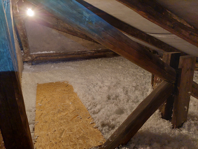 V půli června 2024 jsme jeli zateplit strop nad vytápěným podkrovím, a to z prostoru půdy. Půda byla členitá, místy prkna a místy beton. Pro kontrolu podstřešního prostoru bylo tedy potřeba vytvořit revizní lávku. Tu jsme vystavěli pomocí latí a OSB desek a posléze jsme na podlahu aplikovali přes 30 cm izolace. Izolaci jsme zvolili minerální skelnou – panenské vlákno, které je lehké, nehořlavé a nealergenní.