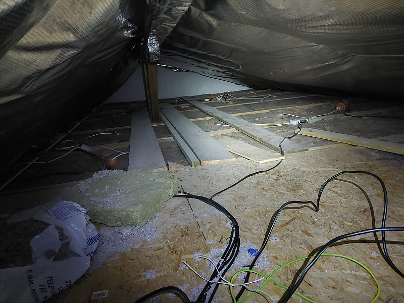 Na začátku května 2024 se Poctivá izolace vydala směrem k lázeňskému městu ve Středočeském kraji, do Poděbrad, zateplit strop přízemního rodinného domu s vestaveným podkrovím. Stávající rodinný dům se sedlovou střechou v řadové zástavbě měl již izolaci v podobě rolované vaty položenou na zavěšeném sádrokartonovém podhledu. Bylo ale potřeba doizolovat nad kleštinami. Nejsnadnějším a nejefektivnějším způsobem je zateplení pomocí foukané tepelné izolace. Nejdříve jsme kolem stropního výlezu v prostoru půdy zhotovili obednění a následně se při pohybu po kleštinách mohla aplikovat foukaná izolace. Na stropě domu tak vznikla souvislá izolační vrstva bez jakýchkoliv tepelných mostů. Jako materiál byla zvolena skelná minerální izolace Supafil loft od společnosti Knauf, kterou náš profi tým proškolených pracovníků nafoukal na sádrokartonový strop ve vrstvě vysoké 30 cm.