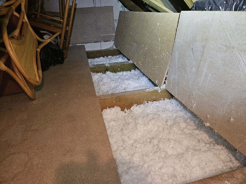 V březnu 2025 zateplila Poctivá izolace strop stávajícího rodinného domu v Praze – Stodůlky. Rodinný dům disponoval sedlovou střechou a krytinou z tašek. Na trámovém stropě nad podkrovím se zespoda nad sádrokartonovým podhledem nacházel parotěs a vrstva stávající izolace. Investor zvýšil pomocí prkna rám stropního výlezu. My jsme odklopili desky, pod nimiž byla stávající izolace a nafoukali jsme novou doplňující 30 cm vysokou vrstvu izolace na plochu cca 50 m2. Jako materiál byla zvolena skelná minerální izolace Supafil loft od společnosti Knauf. Vznikla tak nová plně funkční izolační vrstva bez jakýchkoliv tepelných mostů, která zajistí dokonalý tepelný komfort v domě po celý rok.