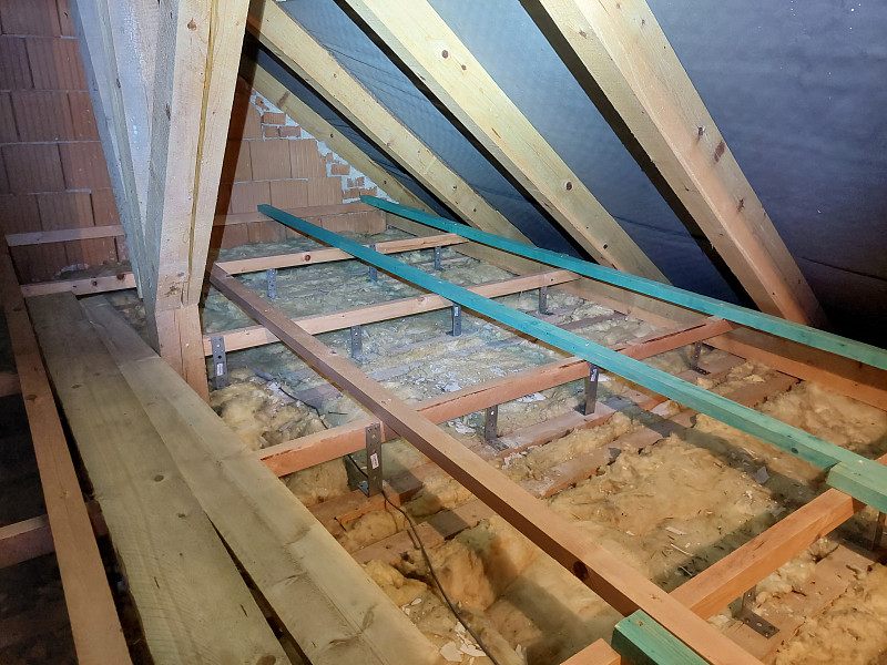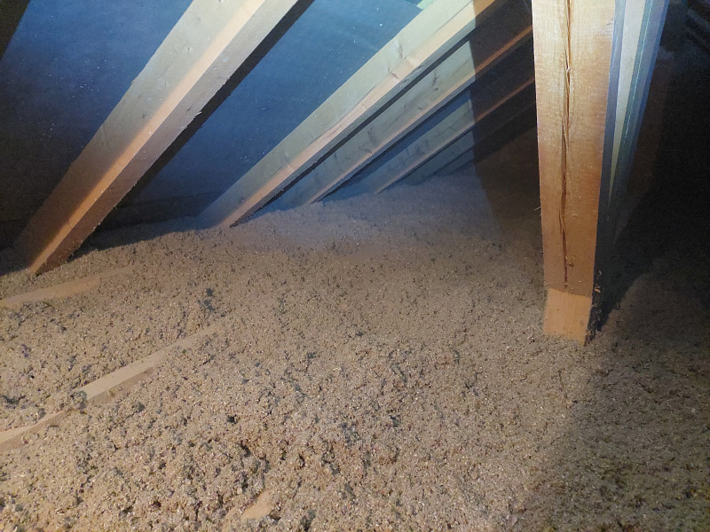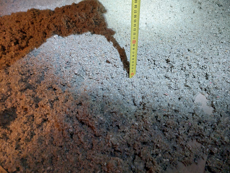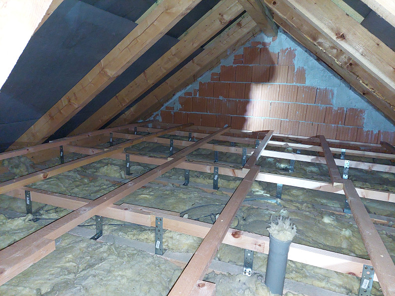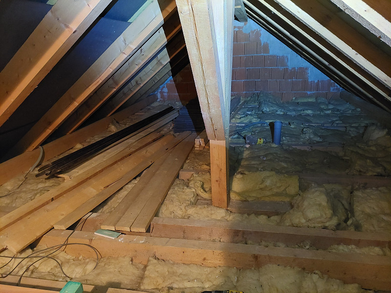 Zateplení stropu podkroví přináší hned dva velké přínosy zároveň. Prvním je snížení nákladu za topení, protože každý centimetr izolace šetří drahé teplo. Druhým přínosem izolace podkroví je snížení letního přehřívání místností pod střechou domu. V rodinném domě v Šestajovicích byla na stropě pouze vrstva 15 cm stávající minerální izolace, což je naprosto nevyhovující zateplení stropu rodinného domu. Není divu, že takto zateplené podkroví v zimě nelze vytopit na vyšší teploty než 17-19°C. V létě je naopak v takto špatně zateplených podkrovních místnostech strašné vedro. Řešení existuje. Provést dodatečné zateplení stropu. Není nutné stávající izolaci vyhazovat. Lze ji zanechat na svém místě a přímo na ni nafoukat další vrstvu izolace. Jakou izolaci použít? Ideálně tu, která bude v zimě udržovat v podkrovních místnostech teplo a v létě zase naopak bude bránit prostupu tepla do místností. Takové izolace existují. Nejlépe k tomuto účelu poslouží buď dřevovláknité izolace nebo celulózové izolace čili papírové izolace. Oba dva druhy izolací mají z rodiny tepelných izolací největší měrnou kapacitu tepla, což je ukazatel, který nám říká kolik tepla dokáží do sebe absorbovat, než jimi teplo prostoupí dále. Nemusíte se bát, že by papírová izolace slehla. Pokud se obrátíte na renomovanou aplikační společnost například Poctivou izolaci, tak při aplikaci foukaných celulózových a dřevovláknitých izolací obdržíte takovou objemovou hustotu nové vrstvy izolace, že Vám budeme garantovat dlouhou zárukou nesléhavost nové izolační vrstvy. Pro zlepšení tepelného komfortu v podkroví lze použít i foukané minerální izolace, jako například Supafil. Minerální izolace sice mají o něco horší ukazatel měrné kapacity tepla. Nicméně i ony pomohou snížit vliv letního přehřívání a skvěle udrží teplo v zimním období. Navíc jsou včetně Supafilu nehořlavé. Supafil navíc v sobě neobsahuje žádné přídavné chemické látky. Majitel domu v Šestajovicích se rozhodl využít pro izolaci podkroví foukanou papírovou izolaci. Poctivá izolace na půdě domu ještě před aplikací foukané izolace provedl montáž roštu pro novou podlahu. Společně s vyšší vrstvou izolace bylo nutné zvýšit i půdní podlahu. Pro tento účel existuje několik technických řešení, jak zhotovit nový podlahový rošt nad podkrovní půdou. Poctivé izolaci se osvědčili tesařské úhelníky a střešní latě. Takto postavený rošt zvládne standardní zatížení půdních podlah, které je definováno zatížením 150 kg/m2. Vrchní záklop z prken si majitel domu již provedl svépomoci.
