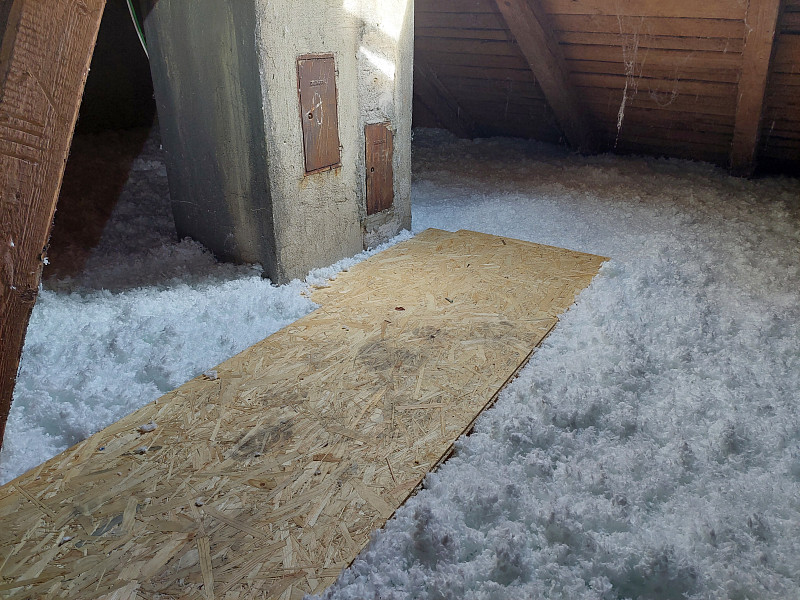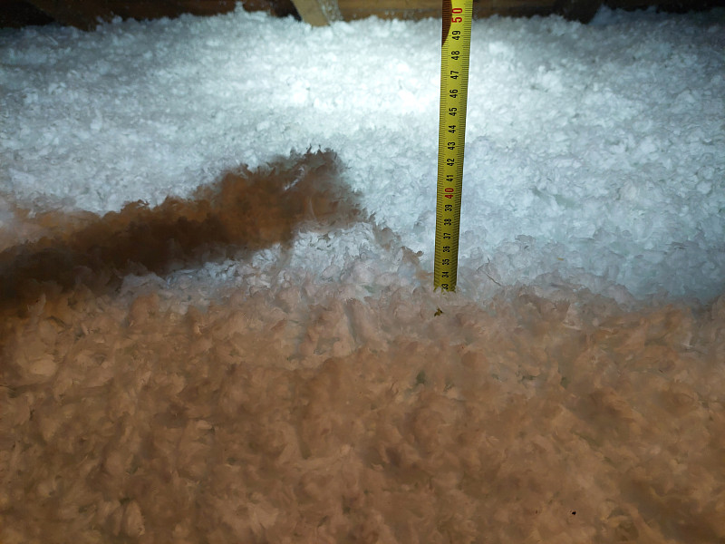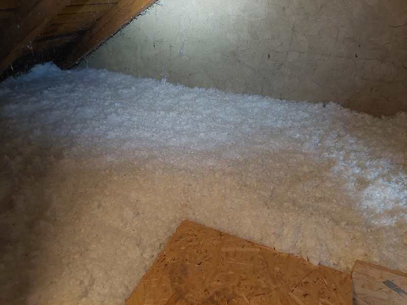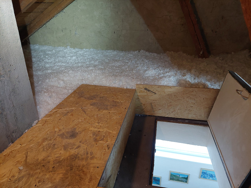 V polovině července 2024 jela naše dvojice foukačů Poctivá izolace směrem k Moravské Třebové, aby zde zateplila stávající patrový rodinný dům. Domek navazující štítem na přilehlý rodinný dům – dvojdomek – prošel revitalizací nové střešní krytiny a fasády. Nyní už jen chyběla izolace stropu. Domek měl funkční komín, klasický stropní výlez a krásnou betonovou podlahu půdy. Na celkovou plochu asi 50 m2 bylo tedy třeba zhotovit novou vrstvu izolace. Nejdříve jsme tedy obednili stropní výlez – zvýšili rantl – vystavěli revizní lávku ke komínu a poté jsme již mohli aplikovat foukanou tepelnou izolaci. Jako materiál byla zvolena skelná minerální izolace z panenského bílého vlákna od společnosti Knauf Insulation, kterou náš profi tým proškolených pracovníků nafoukal na betonový strop ve vrstvě vysoké 30 cm. Vznikla tak nová plně funkční izolační vrstva bez jakýchkoliv tepelných mostů, která zajistí dokonalý tepelný komfort v domě po celý rok.