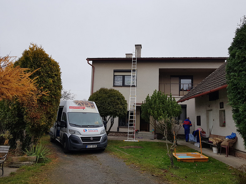 Majiteli domu v Chotusicích Poctivá izolace zhodnotila stropní konstrukci jako vyhovující pro zateplení foukanou izolací. I když se na podlaze půdy nachází slabá vrstva stávající izolace překrytá asfaltovou lepenkou. Po aplikaci foukané izolace bude asfaltová lepenka stále v teplé zóně a díky dostatečně vysoké vrstvě foukané izolace nebude docházet ke kondenzaci vodních par. Pro všechny, kteří by měli pochybnosti Poctivá izolace provede výpočet bilance vodních par v průběhu roku, který sdělí, zda v izolované konstrukci ke kondenzaci vodních par bude či nebude docházet. Majiteli domu jsme doporučil pro zateplení stropu použít izolační materiál Supafil. A to z mnoha důvodů. Jedním z nich je, že je nehořlavý s reakcí na oheň A1. To v praxi znamená, že jej můžeme nafoukat přímo k tělesu komína, aniž bychom dům do budoucna potencionálně ohrozili vznikem požáru. Na toto pozor. Některé izolace nemohou přijít do kontaktu s komínem. Například celulózové čili papírové, dřevovláknité nebo polystyrénové izolace. V Poctivých izolacích Vám vždy dobře poradíme.
