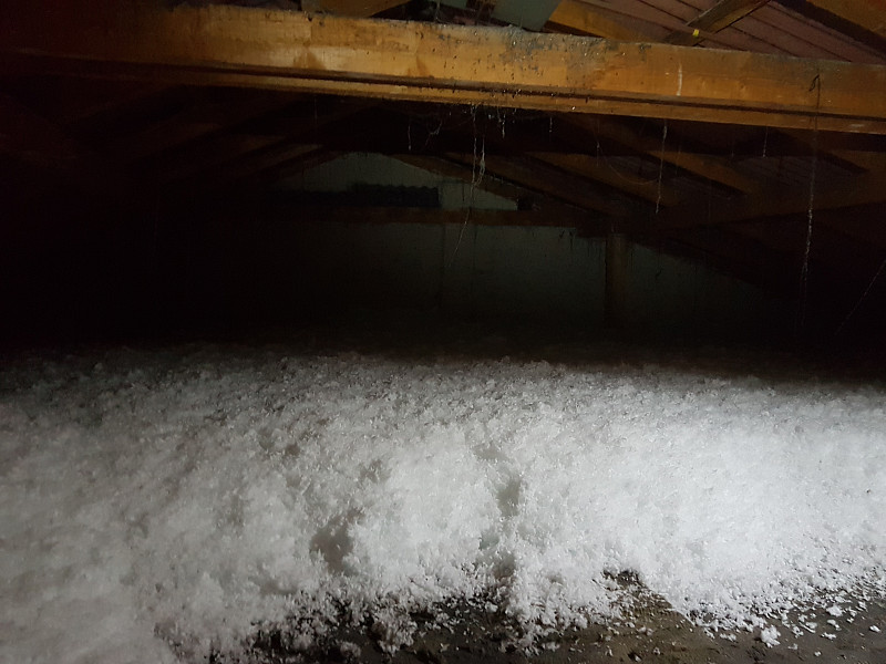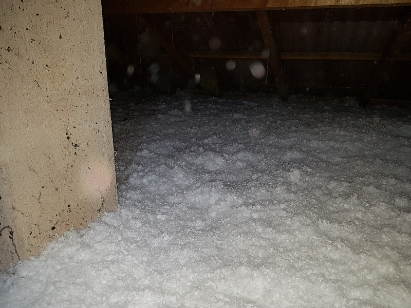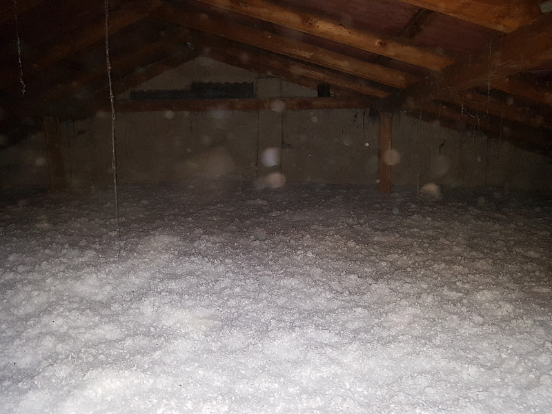 Zateplení stropu stávajícího rodinného domu v Chotusicích Poctivá izolace zrealizovala v listopadu 2021. Stávající rodinný dům se sedlovou střechou s nízkým sklonem. Stropní konstrukce domu je tvořena hurdiskovým systémem. Zastřešení domu tvoří plná trámová vazba. Půdní prostor majitel domu žádným způsobem nevyužívá, a proto jsem zateplení stropu provedli přímo na podlahu půdy bez jakýchkoliv revizních lávek nebo odkládacích prostor pro sezonní věci. Na podlaze půdy byla rozložena stará nefunkční tepelná izolace ve formě skelné vaty o výšce cca 5 cm. Stávající izolace by překrytá asfaltovou lepenkou. Majiteli domu jsme doporučili tepelnou izolaci Supafil. Vrstva nafoukané izolace činila 38 cm.