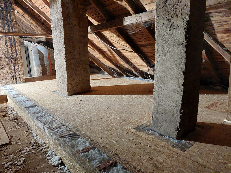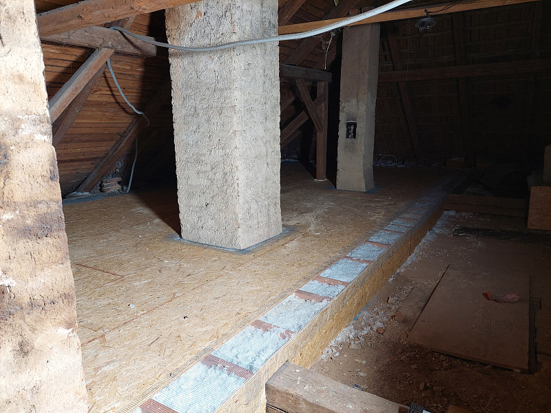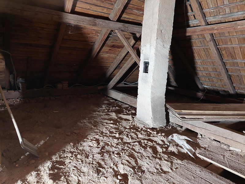 V půli května zateplila Poctivá izolace strop stávajícího rodinného domu u Humpolce, kdy jsme se vrátili do Krasoňova na další realizaci. Rodinný dům disponoval valbovou střechou s krytinou z tašek na latích a prkenným bedněním. Podlaha půdy měla prkenný záklop na trámové konstrukci stropu. Do této dutiny na polovině plochy stropu náš profi tým proškolených pracovníků nafoukal 30 cm vysokou vrstvu izolace. Na dalších 50 m2 plochy půdy, kde dutina byla plna násypu z půdovek, se izolace nafoukala na prkenný záklop s tím, že se po srovnání násypu i na záklopu položila geotextilie a parotěsná folie. Vystavěl se dřevěný rošt, nafoukala se též 30 cm vysoká vrstva izolace a rošt se zaklopil OSB deskami. Tím zůstala půda nadále celá pochozí. Jako materiál byla zvolena skelná minerální izolace Ursa Pure Floc od společnosti Ursa. Vznikla tak nová plně funkční izolační vrstva, která zajistí dokonalý tepelný komfort v domě po celý rok a půdní prostor zůstane nadále pochozí.