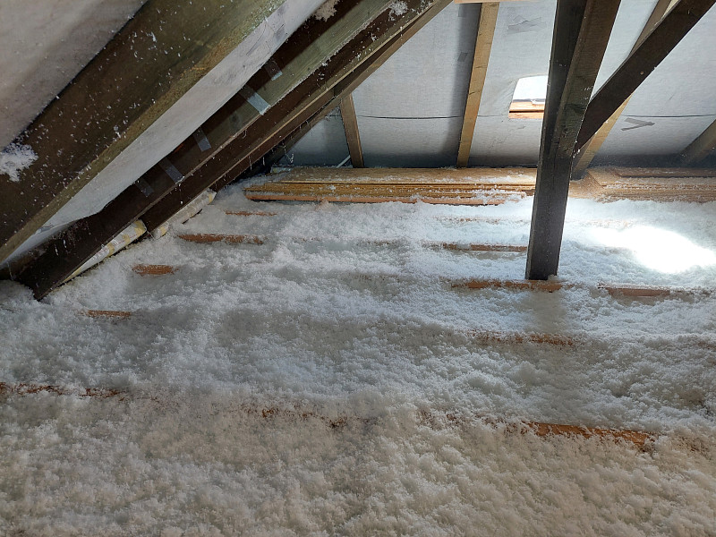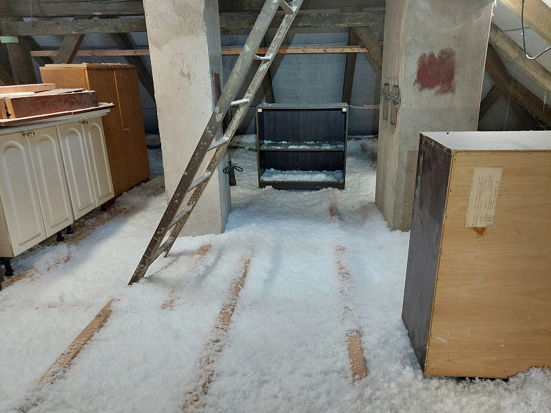 V září 2024 zateplila Poctivá izolace stávající rodinný dům v Dolních Beřkovicích. Patrový rodinný dům s valbovou střechou ve tvaru čtverce s trámovou střešní konstrukcí jsme zateplili pomocí foukané izolace do dřevěného roštu, který si majitel vystavěl svépomocí na betonové podlaze půdy. Výška špalků byla cca 45 cm, vrstva izolace byla 36 cm. Tím byla splněna odvětrávaná mezera a majitel si může následně svépomocí zaklopit OSB deskou. Po delších stranách nezaklopí, aby izolace měla prostor odvětrávat. Jako materiál byla zvolena skelná minerální izolace Ursa Pure Floc od společnosti Ursa, kterou náš profi tým proškolených pracovníků nafoukal do předem připraveného dřevěného roštu ve vrstvě vysoké 36 cm. Vznikla tak nová plně funkční izolační vrstva bez jakýchkoliv tepelných mostů, která zajistí dokonalý tepelný komfort v domě po celý rok.
