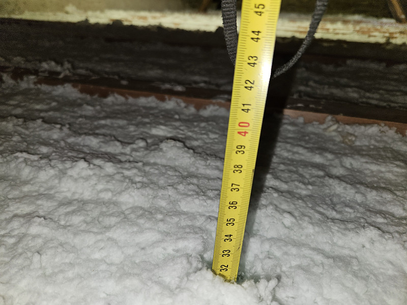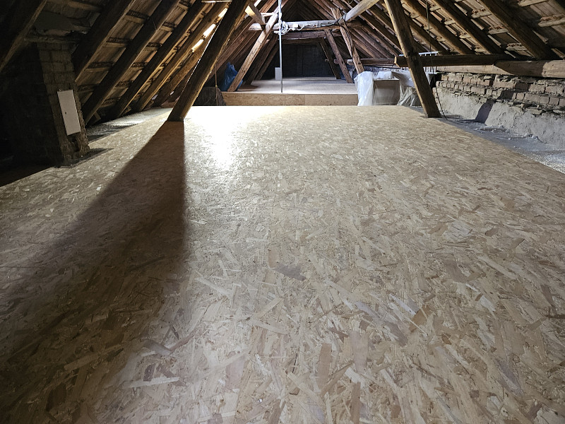 V polovině května 2025 zateplila Poctivá izolace strop stávajícího rodinného domu ve Znojmě. Rodinný dům disponoval sedlovou střechou s krytinou z tašek na latích. Na trámovém stropě, na podlaze půdy, byla část s půdovkami na zásypu a část s betonovou krustou. Jakmile měl investor trámový krov ošetřen proti dřevokaznému hmyzu, mohl přijet náš profi tým proškolených pracovníků na realizaci zateplení stropu. Nejdříve se na podlahu půdy rozložila geotextílie, na níž se s řádnými přelepy položila parotěsná fólie. Na takto připravený povrch se vystavěl pomocí špalků a latí dřevěný rošt, nafoukala se na celou plochu 96 m2 nad vytápěným přízemím 30 cm vysoká izolační vrstva a rošt se zaklopil OSB egger deskami tloušťky 18 mm. Mezi samotnou izolací a záklopem deskami se pomocí latí vytvořila větraná mezera pokračující odvětráním u pozednice, kde se nezaklopil 0,5m široký pás OSB deskou, nýbrž pletivem. Jako materiál byla zvolena skelná minerální izolace Supafil loft PRO od společnosti Knauf. Vznikla tak nová plně funkční izolační vrstva bez jakýchkoliv tepelných mostů, která zajistí dokonalý tepelný komfort v domě po celý rok a taktéž může být půdní prostor nadále využíván.