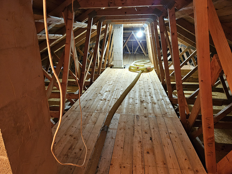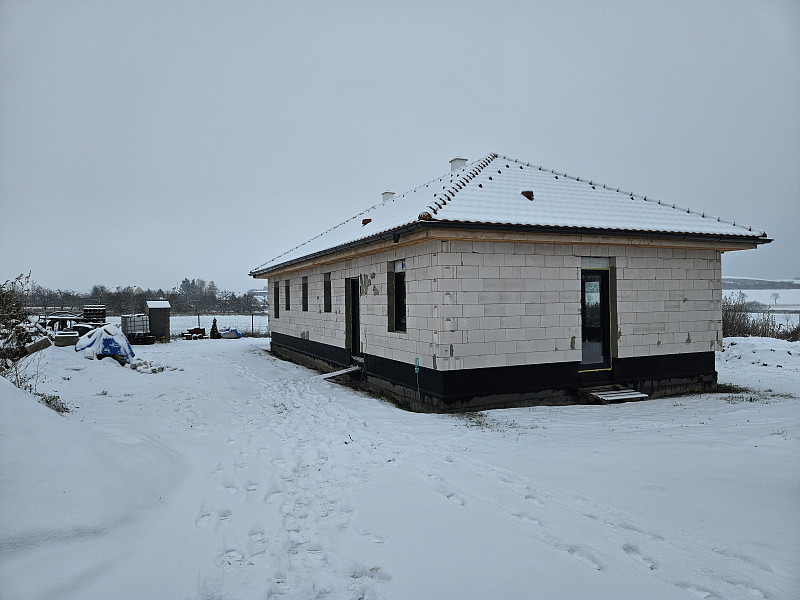 Ke konci listopadu 2025 zateplila Poctivá izolace strop novostavby zděného rodinného domu v Podviní, v části obce Trnovany. Dům disponoval valbovou střechou s krytinou z tašek na prkenném podbití. Pod spodní pásnicí vazníkové konstrukce krovu byly kotveny OSB desky, pod nimiž byl svěšen sádrokartonový podhled. Na celkovou plochu asi 150 m2 bylo tedy třeba zhotovit izolační vrstvu na OSB desky, mezi a nad vazníky. Jako materiál byla zvolena skelná minerální izolace Supafil loft PRO od společnosti Knauf, kterou náš profi tým proškolených pracovníků nafoukal na strop ve vrstvě vysoké 50 cm. Vznikla tak plně funkční izolační vrstva bez jakýchkoliv tepelných mostů, která zajistí dokonalý tepelný komfort v domě po celý rok.