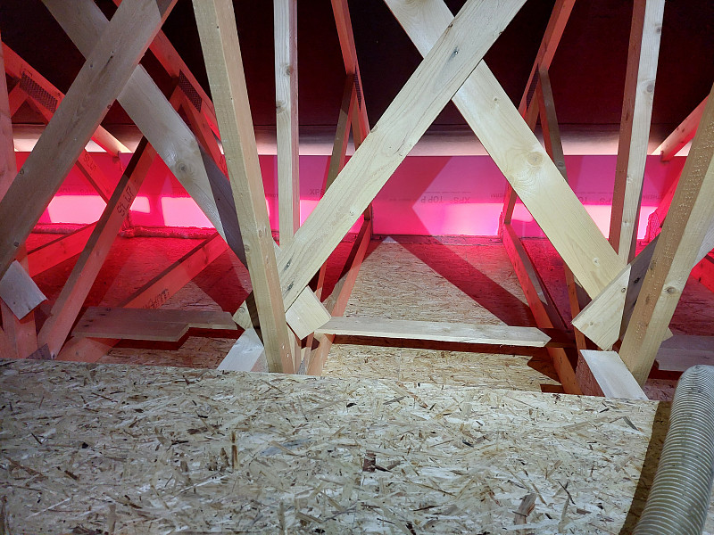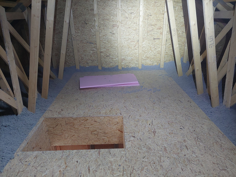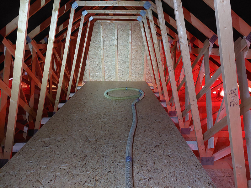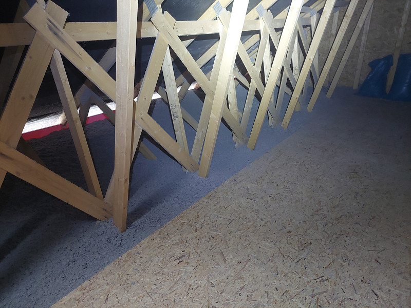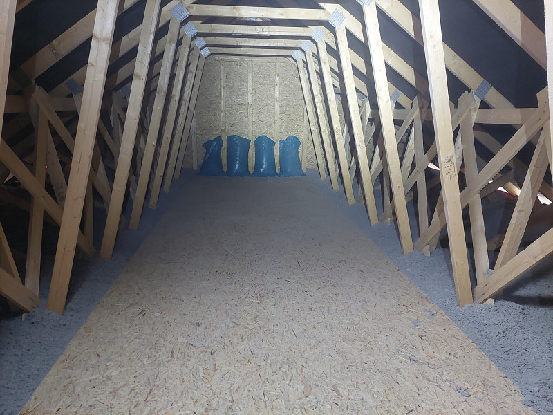 V prosinci 2024 zateplila Poctivá izolace novostavbu rodinného domu v Troubkách. Dům disponoval sedlovou střechou s plechovou krytinou taškoplech a vazníkovou konstrukcí krovu. Pod spodní pásnicí vazníků byla OSB podlaha a středem studiového vazníku procházela pochozí plocha. Na celkovou plochu asi 90 m2 nafoukal náš profi tým proškolených pracovníků 40 cm vysokou izolační vrstvu mezi vazníky a na obvodovou zeď k zarážce k EPS lemu na obvodové zdi. Jako materiál byla zvolena celulózová izolace Thermofloc F, která má díky své vyšší objemové hmotnosti výborné akumulační vlastnosti proti přehřívání místností pod stropem v létě. Vznikla tak nová plně funkční izolační vrstva bez jakýchkoliv tepelných mostů, která zajistí dokonalý tepelný komfort v domě po celý rok.