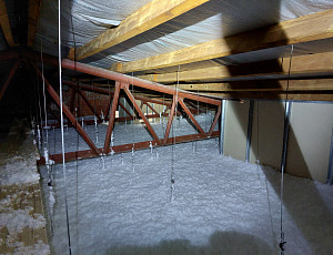 Při zateplování stávající výrobní haly se sedlovou střechou a vazníkovou konstrukcí krovu v Liberci bylo třeba vytvořit novou, zvýšenou izolační vrstvu. Jedině foukaná izolace dokáže ve vazníkové střešní konstrukci efektivně vytvořit souvislou vrstvu zateplení stropu bez tepelných mostů. Díky Poctivé izolaci navíc budete mít zatepleno rychle, dokonale a hlavně poctivě. Jako materiál byla v případě zateplení haly použita minerální skelná izolace Supafil loft PRO od společnosti Knauf. Supafil má mnoho skvělých výhod – nesléhává, je prodyšný, nehořlavý, ekologický a má nízkou objemovou hmotnost. Poctivá izolace má ve své nabídce celkem 5 druhů izolačních materiálů. Krom minerálních skelných izolací jsou to rovněž minerální čedičové izolace, celulózové neboli papírové izolace, dřevovláknité a polystyrénové izolace. S výběrem toho pravého izolačního materiálu pro Váš typ konstrukce Vám v Poctivé izolace rádi poradíme a pomůžeme. Máme za sebou již stovky zakázek a řadu let zkušeností, o které se s Vámi rádi podělíme. Poptejte si zateplení stropu či střechy i Vy.
