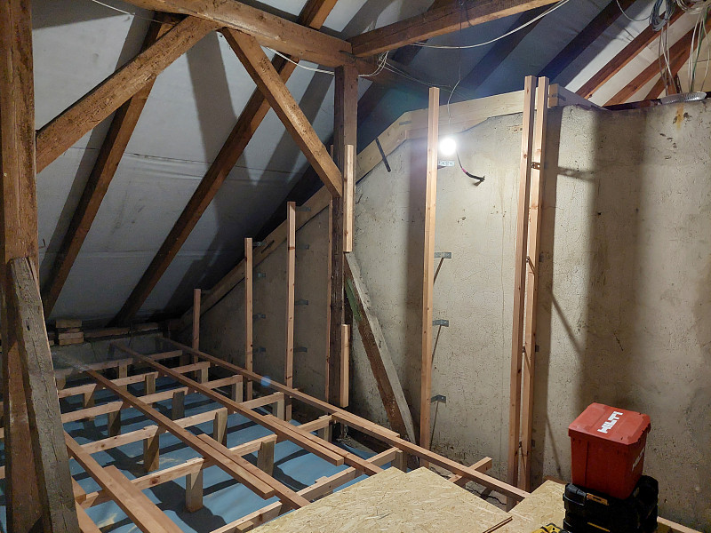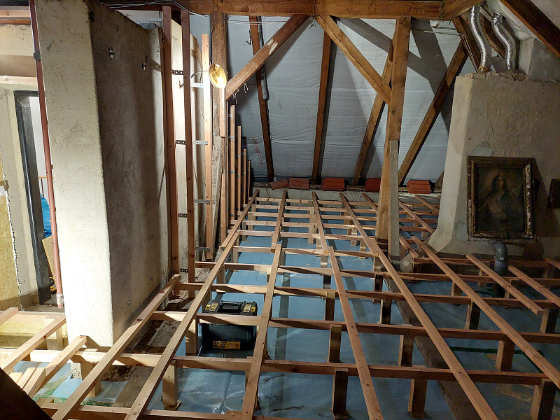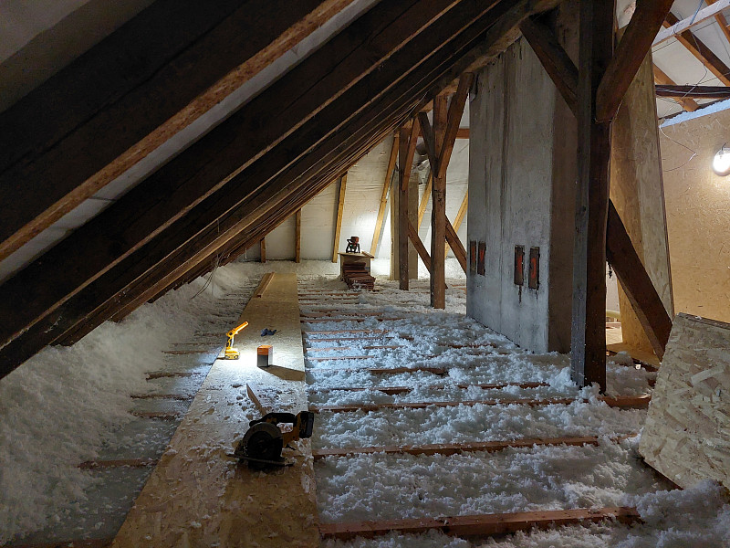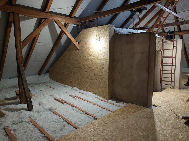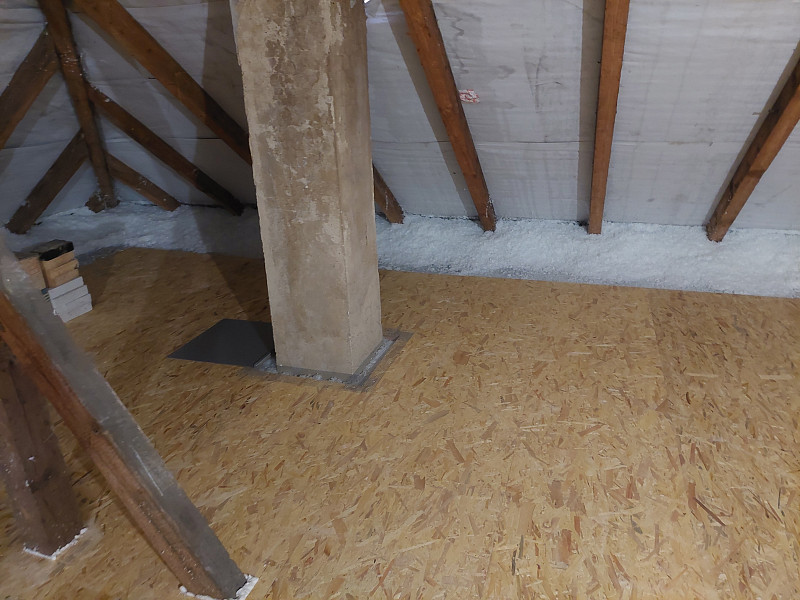 V září 2025 zateplila Poctivá izolace strop bytového domu ve Spělově, který procházel opatřeními pro energetické úspory domu. Jedním z opatření bylo i zateplení stropu z prostoru půdy. Patrový dům s valbovou střechou a trámovou konstrukcí krovu, kde podlaha byla betonová, chtěli vlastníci ponechat nadále pochozí. Náš profi tým proškolených pracovníků na celou podlahu rozvinul parotěsnou fólii, vystavěl dřevěný rošt jak na podlahu, tak i na vstupní obestavbu a nafoukal 30 cm vysokou vrstvu izolace v ploše cca 150 m2. Pomocí latí pracovníci vytvořili větranou mezeru mezi izolací a následným záklopem z OSB egger desek. Jako materiál byla zvolena skelná minerální izolace Supafil loft PRO od společnosti Knauf. Vznikla tak nová plně funkční izolační vrstva bez jakýchkoliv tepelných mostů, která zajistí dokonalý tepelný komfort v domě po celý rok.