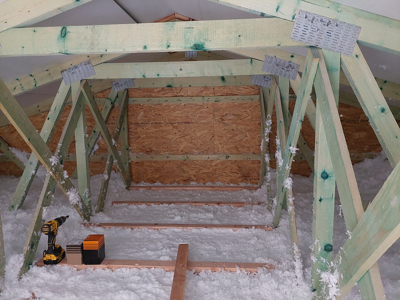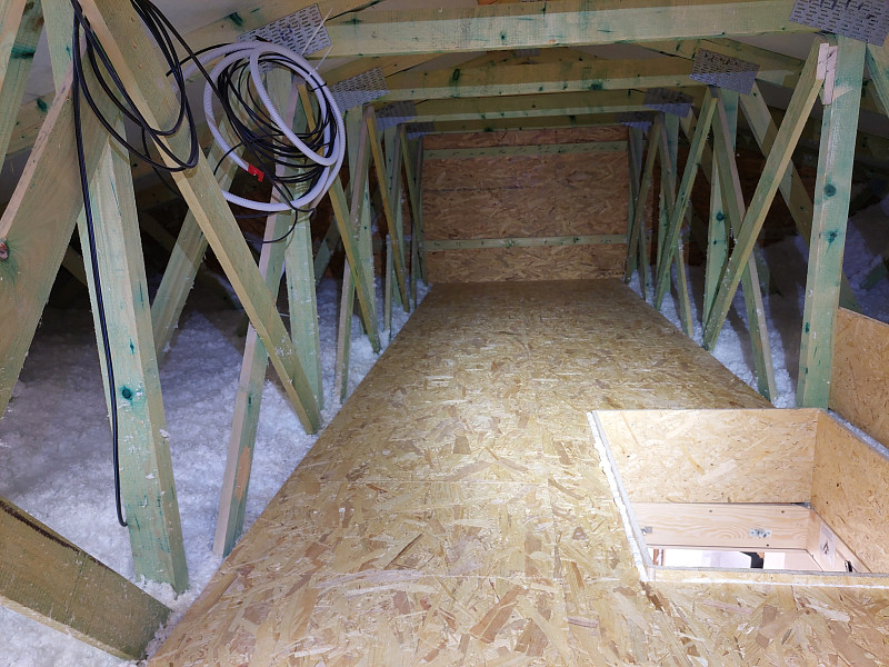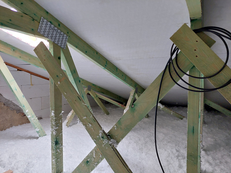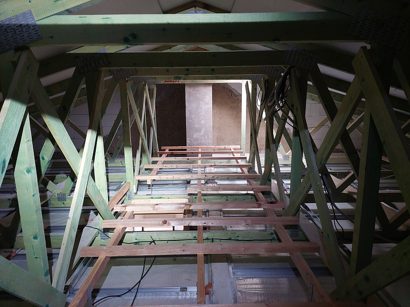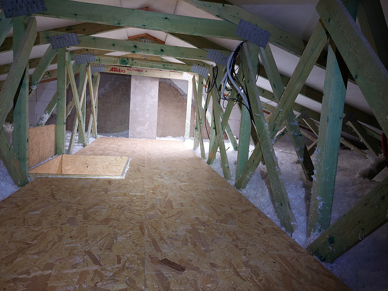 Začátkem září 2025 zateplila Poctivá izolace strop stávajícího zděného patrového domu ve Vlašimi. Rodinný dům, který sestával jako dvojdomek, měl sedlovou střechu nově po rekonstrukci a krov ze sbíjeného studiového vazníku. Pod spodní pásnicí byl svěšen rošt se sádrokartonovým podhledem a parotěsnou fólií. Aby mohl být půdní prostor využíván k uskladnění sezónních věcí a též mohl být podstřešní prostor kontrolován, vystavěl náš profi tým proškolených pracovníků ve vazníku nejdříve rošt pomocí úhelníků a latí, kolem stropního výlezu vytvořil obednění (zvýšil rám) a na celou plochu půdy cca 74 m2 nafoukal na sádrokartonový strop mezi vazníky 40 cm vysokou izolační vrstvu. Posléze pomocí latí vytvořil mezi izolací a následným záklopem z OSB desek větranou mezeru. Jako materiál byla zvolena skelná minerální izolace Ursa Pure Floc od společnosti Ursa. Vznikla tak nová plně funkční izolační vrstva bez jakýchkoliv tepelných mostů, která zajistí dokonalý tepelný komfort v domě po celý rok.