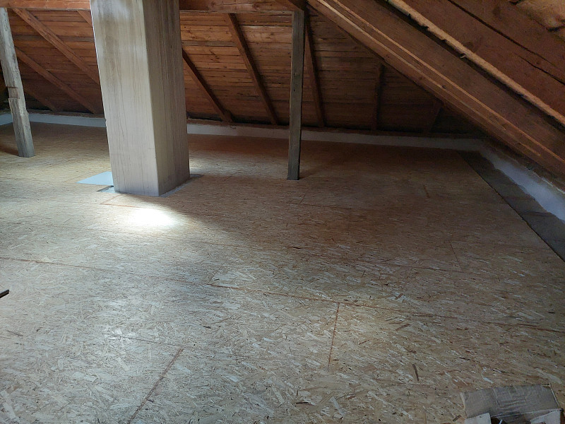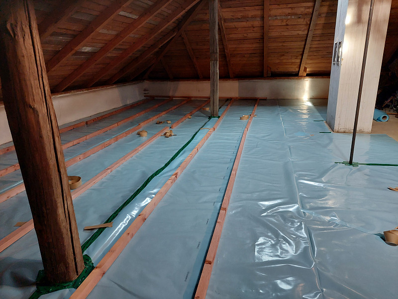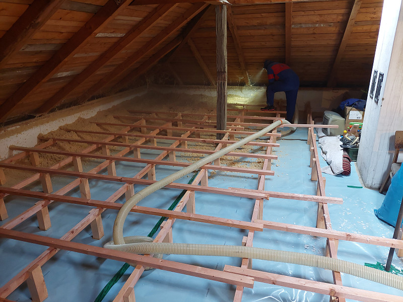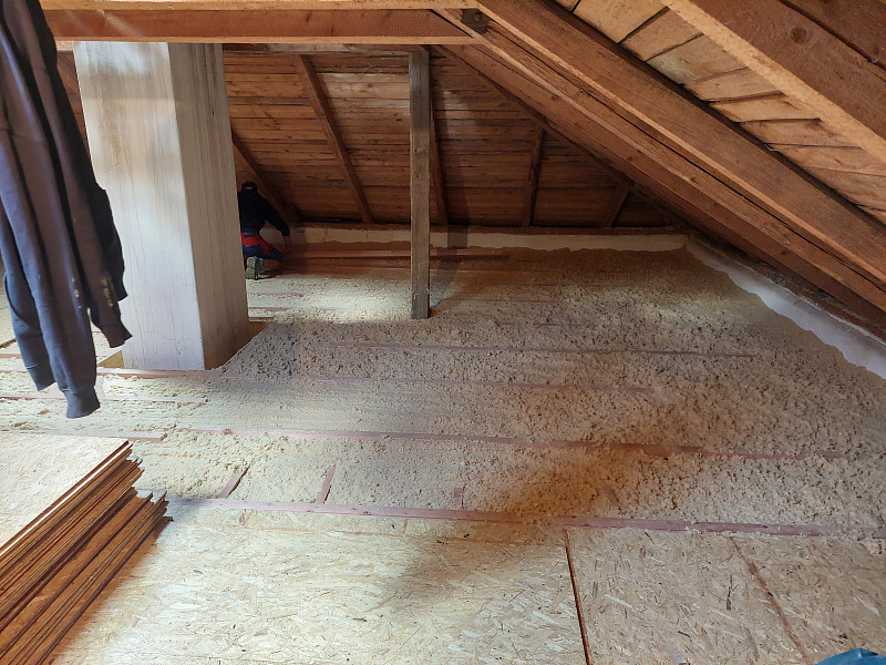 V půli května 2025 zateplila Poctivá izolace stávající rodinný dům v Krasoňově u Humpolce. V rámci energetických úspor domu se investor rozhodl zateplit strop z prostoru nevytápěné půdy tak, aby mohla být půda nadále využívána ke svému účelu. Patrový rodinný dům disponoval valbovou střechou, krytinou z šablon na prkenném bednění a trámovým krovem. Nejdříve tedy náš profi tým proškolených pracovníků na 110 m2 betonové plochy půdy rozvinul parotěsnou fólii. Posléze zvýšil rám stropního výlezu, na podlahu vystavěl pomocí špalků a latí dřevěný rošt, do něhož následně nafoukal 30 cm vysokou vrstvu izolace. Jako záklop byly použity OSB desky, kde mezi izolací a OSB deskami se pomocí latí vytvořila 4cm odvětrávaná mezera, která navazovala k pozednici, kde pruh 0,5m od pozednice se nezaklápěl, nýbrž se na rošt připevnilo kovové pletivo. Kolem komína se nafoukala minerální izolace a na zbylou plochu půdy byla zvolena dřevovláknitá izolace Steico zell od společnosti Steico. Vznikla tak nová plně funkční izolační vrstva bez jakýchkoliv tepelných mostů, která zajistí dokonalý tepelný komfort v domě po celý rok a půda může být využívána jako doposud.