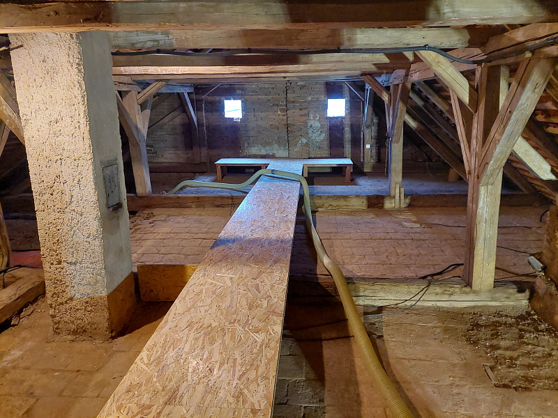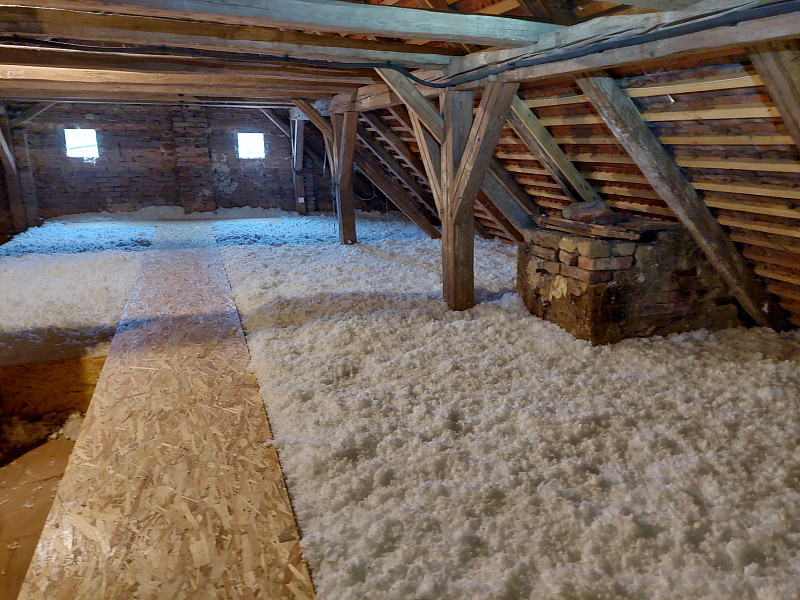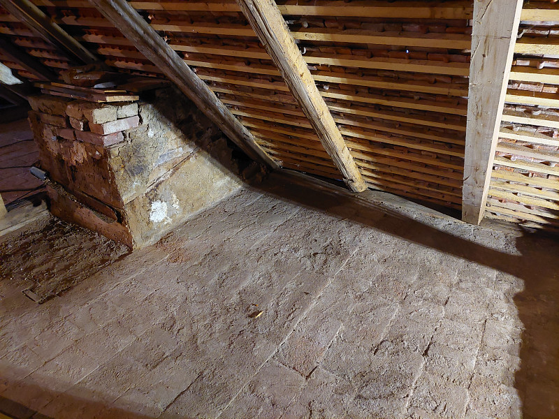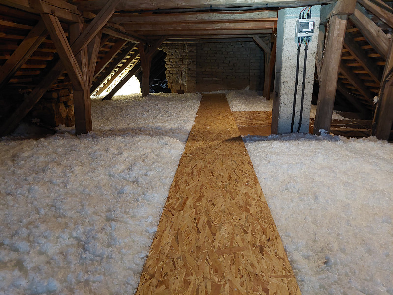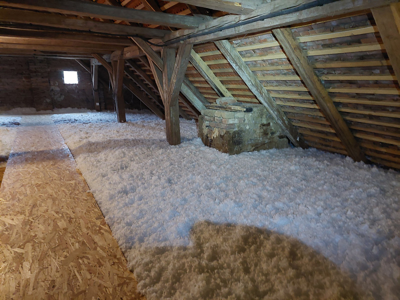 V listopadu 2024 zateplila Poctivá izolace stávající rodinný dům, bývalou usedlost v Dešné. Dům se sedlovou střechou, krovem z trámové vazby a podlahou s půdovkami na násypu nad prkenným záklopem si investorka přála zateplit shora z půdního prostoru, kde by se vystavěla středem a kolem komínů revizní lávka. Snížená část podlahy nad klenbovím byla zaizolována stejnou vrstvou izolace a to 30 cm. Jako materiál byla zvolena skelná minerální izolace Supafil loft od společnosti Knauf, kterou náš profi tým proškolených pracovníků nafoukal na strop ve vrstvě vysoké 30 cm. Vznikla tak nová plně funkční izolační vrstva bez jakýchkoliv tepelných mostů, která zajistí dokonalý tepelný komfortv domě po celý rok.