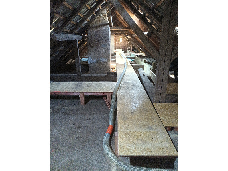 V červnu 2025 zateplila Poctivá izolace strop stávajícího rodinného domu, bývalé zemědělské usedlosti v Markétě. Rodinný dům disponoval sedlovou střechou do L a krytinou z tašek na latích. Izolaci stropu provedl náš profi tým proškolených pracovníků z prostoru půdy, kde podlaha byla různorodé skladby. Část s prkenným záklopem, část se škvárou a hliněnkou. V členění vytápěné a nevytápěné zóny se vytvořil lem z minerálních desek a na podlahu, kde nebyl soudržný povrch, se položila geotextilie. Následně se po celé délce půdy vystavěla revizní lávka a na cca 90 m2 se nafoukala 30 cm vysoká vrstva izolace. Jako materiál byla zvolena skelná minerální izolace Supafil loft od společnosti Knauf. Vznikla tak nová plně funkční izolační vrstva bez jakýchkoliv tepelných mostů, která zajistí dokonalý tepelný komfort v domě po celý rok.