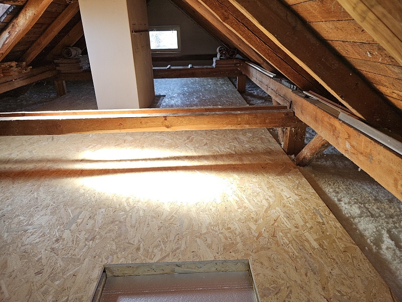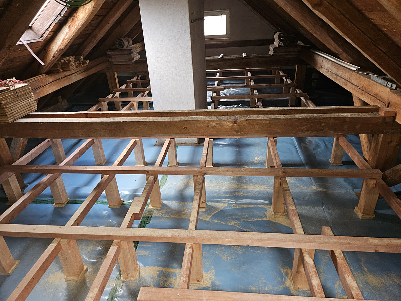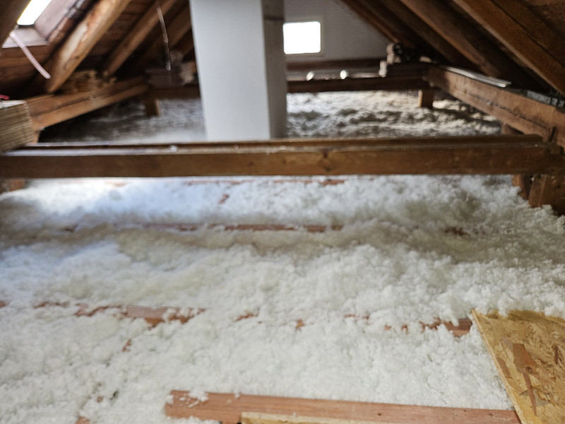 V březnu 2025 zateplila Poctivá izolace stávající patrový rodinný dům v Lázních Bělohrad. Rodinný dům disponoval sedlovou střechou s krytinou z tašek na latích bez střešní fólie. Na trámovém stropě s betonovou podlahou náš profi tým proškolených pracovníků položil parotěsnou fólii a řádně přelepil. Rám stropního výlezu obednil a na středovou část půdy, od štítu ke štítu, vystavěl pomocí špalků dřevěný rošt. Na celou plochu půdy cca 60 m2 nafoukal 30 cm vysokou vrstvu tepelné izolace, pomocí latí vytvořil větranou mezeru mezi izolací a následným záklopem z OSB a u komína položili plechovou desku k vymetacím otvorům. Na víko výlezu přilepili PIR desky pro jeho zateplení. Jako materiál byla zvolena skelná minerální izolace Supafil loft od společnosti Knauf. Vznikla tak nová plně funkční izolační vrstva bez jakýchkoliv tepelných mostů, která zajistí dokonalý tepelný komfort v domě po celý rok.