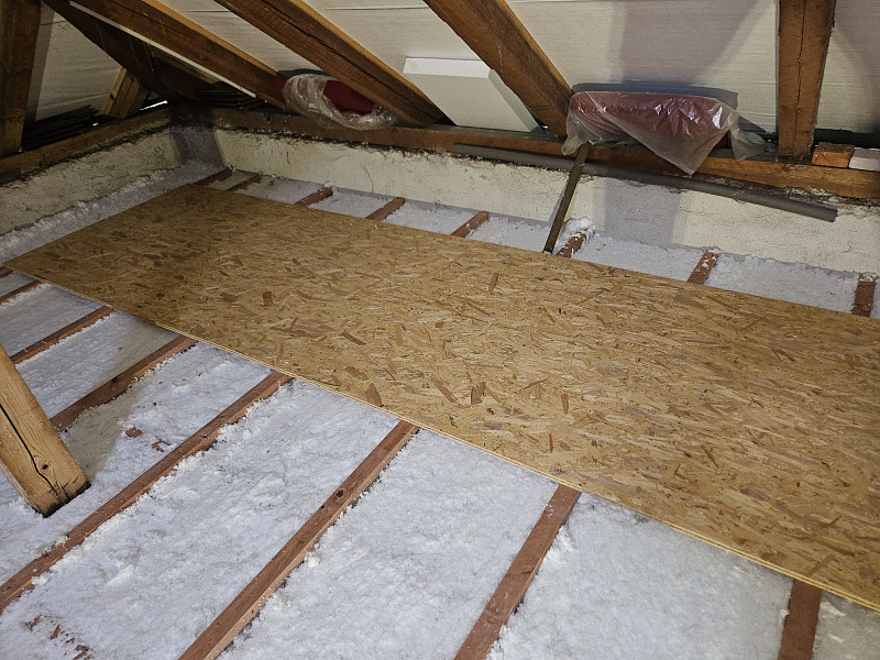 Na samém začátku dubna 2025 zateplila Poctivá izolace stávající rodinný dům v Městci Králové. Patrový rodinný dům disponoval valbovou střechou s krytinou z tašek, u hřebene odvětrávacích, a s pojistnou střešní fólií. Na trámovém stropě s betonovou krustou se nejdříve rozvinula geotextílie, na kterou se následně položila parotěsná folie. Kolem stropního výlezu se pomocí OSB vytvořilo obednění se schůdkem pro snazší přístup. Na takto připravený povrch náš profi tým proškolených pracovníků vystavěl dřevěný rošt, do kterého nafoukal na celou plochu o velikosti cca 98 m2izolační vrstvu 30 cm. Dále pomocí latí vytvořil mezi izolací a následným záklopem z OSB egger desek větranou mezeru. Na závěr se ještě zateplilo víko výlezu. Jako materiál byla zvolena skelná minerální izolace Supafil loft od společnosti Knauf. Vznikla tak nová plně funkční izolační vrstva bez jakýchkoliv tepelných mostů, která zajistí dokonalý tepelný komfort v domě po celý rok.