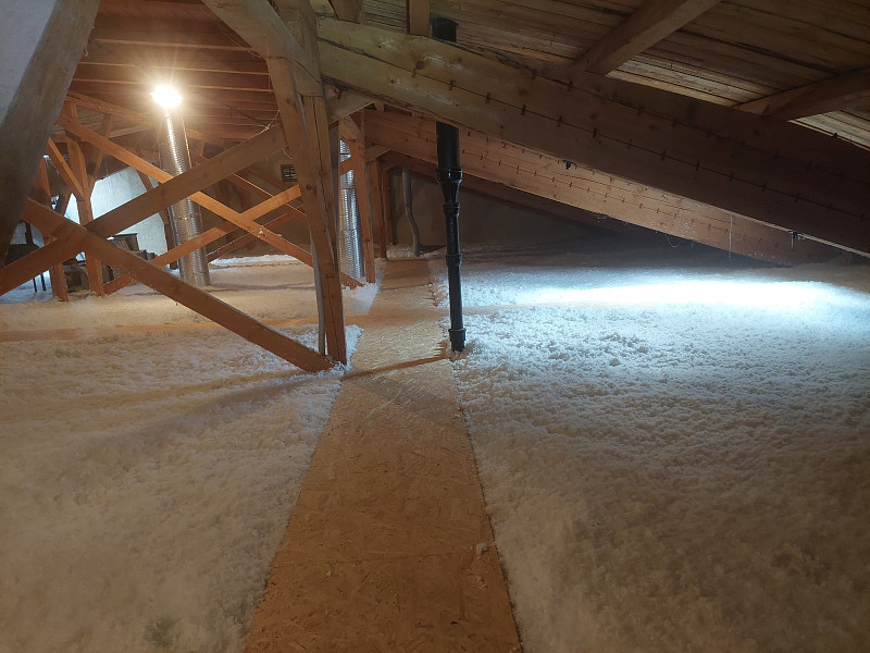 Při zateplování stávajícího objektu v Polné s obloukovou střechou a betonovým stropem se vytvořila souvislá vrstva izolace s vystavěnými revizními lávkami. Jedině foukaná izolace dokáže efektivně vytvořit souvislou vrstvu zateplení stropu bez tepelných mostů. Díky Poctivé izolaci navíc budete mít zatepleno rychle, dokonale a hlavně poctivě. Jako materiál byla v případě zateplení stropu v Polné použita izolace z minerální vlny od společnosti Ursa. Tento izolační materiál má mnoho skvělých výhod – je prodyšný, nehořlavý, ekologický, čistě přírodní (zdravotně nezávadný) a má nízkou objemovou hmotnost. Poctivá izolace má ve své nabídce celkem 5 druhů izolačních materiálů. Jsou to minerální skelné izolace, minerální čedičové izolace, celulózové neboli papírové izolace, dřevovláknité a polystyrénové izolace. S výběrem toho pravého izolačního materiálu pro Váš typ konstrukce Vám v Poctivé izolace rádi poradíme a pomůžeme. Máme za sebou již stovky zakázek a řadu let zkušeností, o které se s Vámi rádi podělíme. Poptejte si zateplení stropu či střechy i Vy.