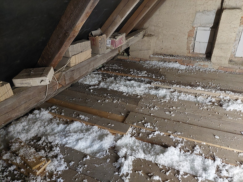 Na konci srpna 2025 zateplila Poctivá izolace strop stávajícího rodinného domu ve Velkém Meziříčí. Rodinný dům disponoval sedlovou střechou a krytinou z tašek. Na trámovém stropě shora byl záklop z prken, které investor v pruhu demontoval, aby nám vytvořil montážní vstup pro foukání izolace do trámové dutiny vysoké 18 cm. Na celkovou plochu asi 90 m2 bylo tedy třeba zhotovit novou vrstvu izolace. Jako materiál byla zvolena skelná minerální izolace Supafil loft PRO od společnosti Knauf, kterou náš profi tým proškolených pracovníků nafoukal do trámové dutiny pod prkenný záklop ve vrstvě vysoké 18 cm s vyšším objemem izolace. Vznikla tak nová plně funkční izolační vrstva, která zajistí dokonalý tepelný komfort v domě po celý rok.