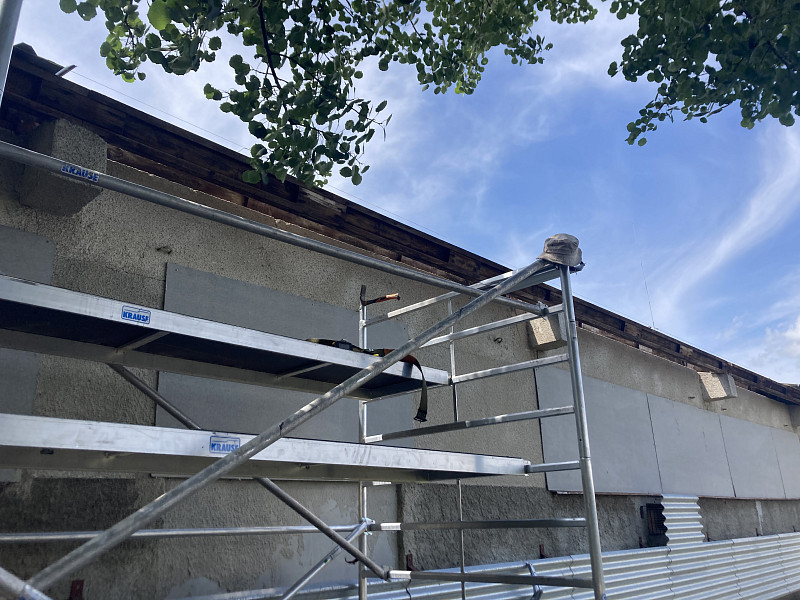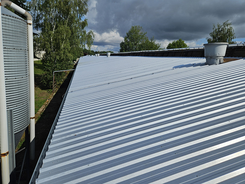 V rámci rekonstrukce na farmě Lažánky v jižních Čechách byla Poctivou izolací vyměněna střešní krytina na jedné z hal určených pro chov drůbeže. Stávající krytina byla demontována a vyměněna za novou z trapézových plechů. Trapézové plechy pak tvořily i oplechování štítu haly a lemování zdí. Součástí nového oplechování střechy bylo samozřejmě i osazení veškerých klempířských prvků a zhotovení kompletního okapového systému.